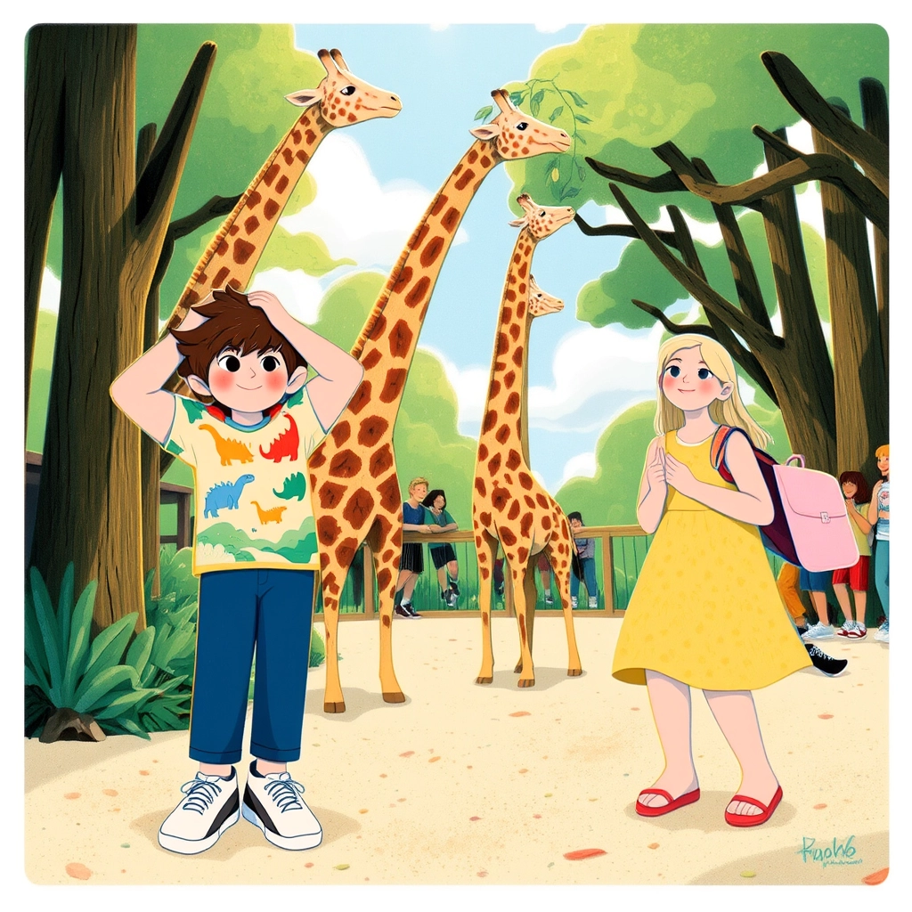 Next, they visited the tall giraffes. [Ben](TW5Z2WK4) marveled at how their long necks allowed them to eat leaves high up in the trees. 'Look, that one is eating from the highest branch!' [Greta](9TGJ4HMP) said, watching a giraffe nibble leaves from a tall acacia tree.