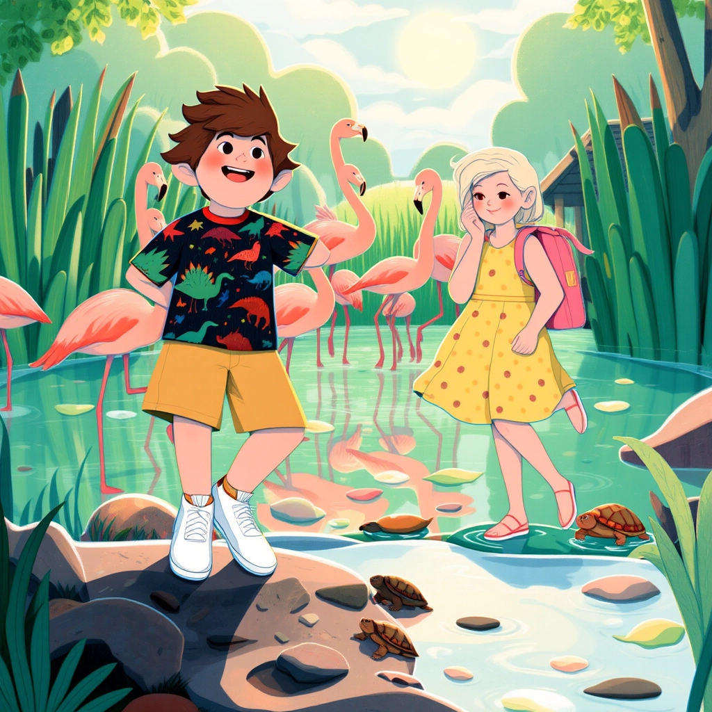 A nearby pond was home to flamingos standing on one leg! 'They’re so pink because of all the shrimp they eat!' [Greta](9TGJ4HMP) explained to [Ben](TW5Z2WK4) after spotting the fact on another sign. They both tried balancing on one leg, giggling!