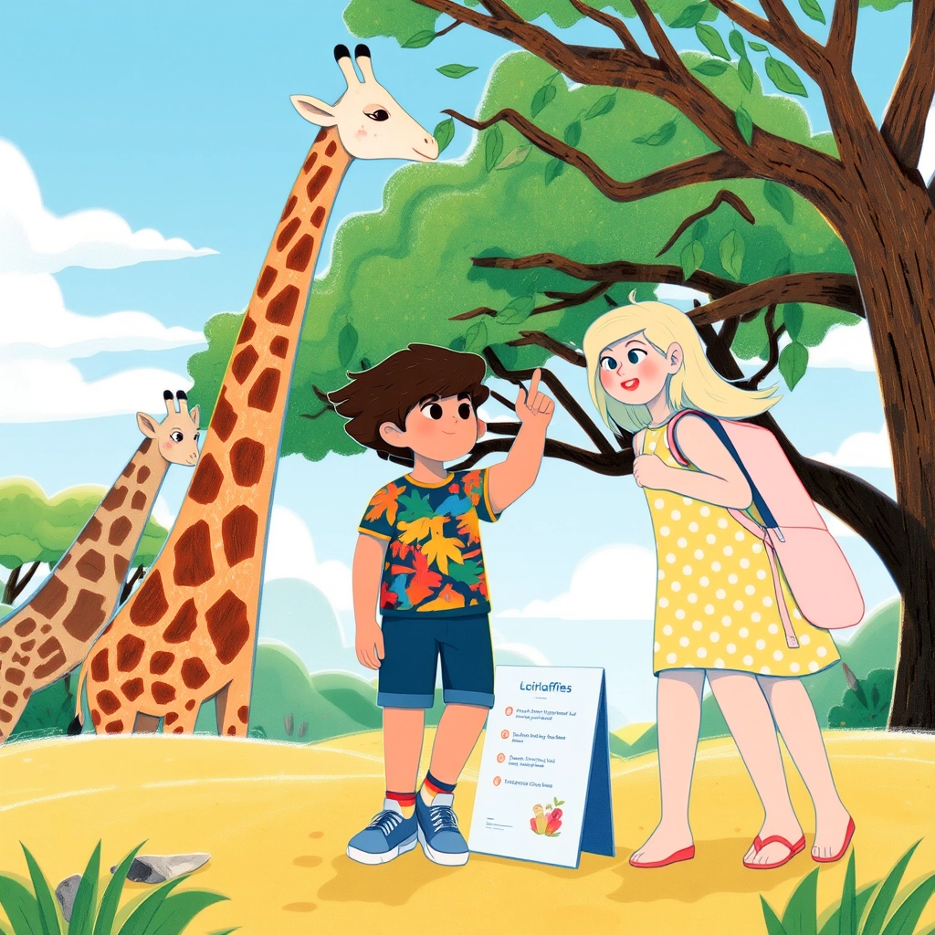 Next, they visited the towering giraffes. [Greta](9TGJ4HMP) observed, 'Wow, their necks are so long!' She spotted a baby giraffe munching on leaves, and [Ben](TW5Z2WK4) leaned over the railing to get a closer look. 'It's like a skyscraper... but it's alive!' he said with amazed eyes.