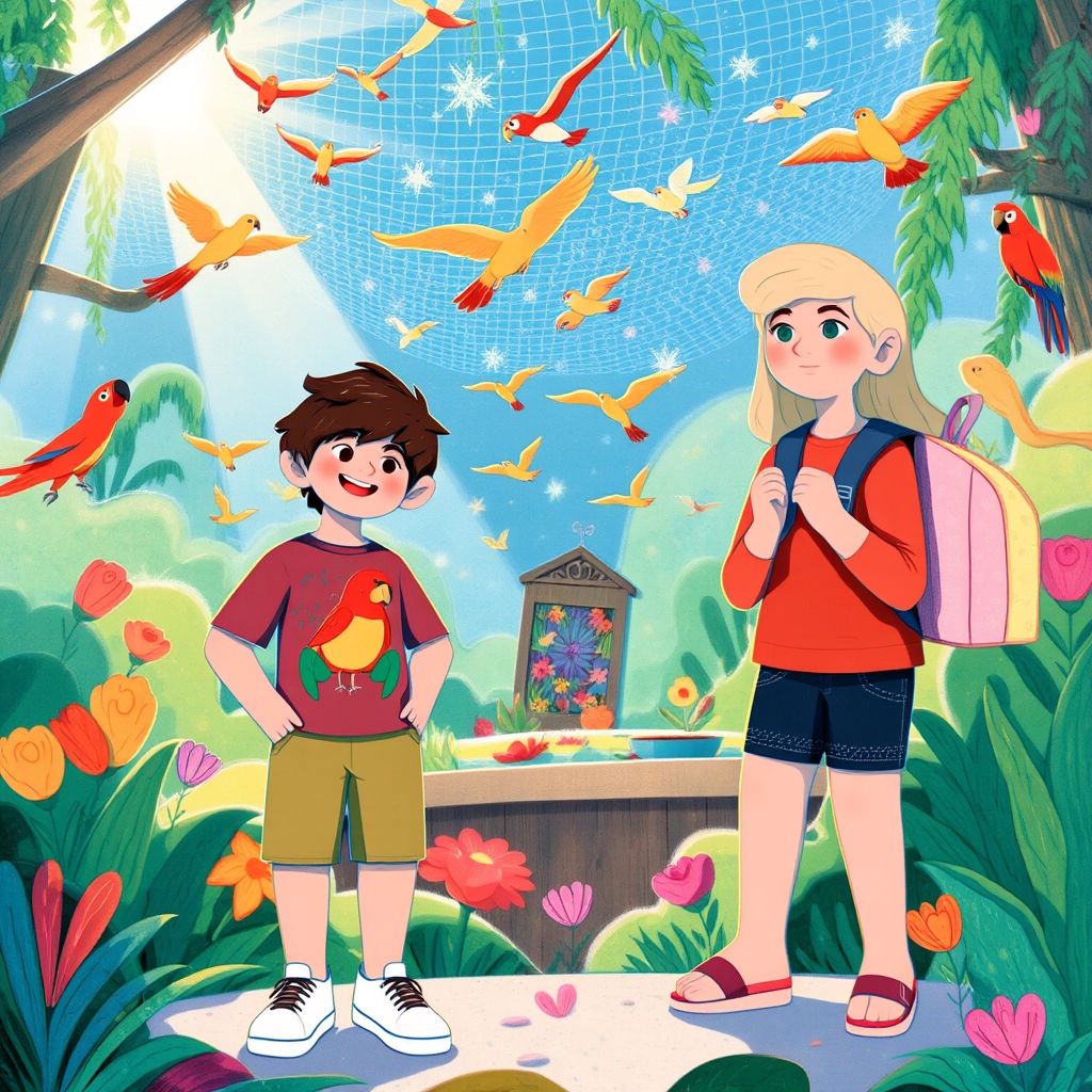 In the aviary, brightly colored parrots flew overhead, chirping and chattering. [Greta](9TGJ4HMP) held out her arm, and a bold, red parrot landed on her shoulder! [Ben](TW5Z2WK4) clapped, 'You look like a pirate now, [Greta](9TGJ4HMP)!' They both laughed as the parrot squawked loudly.