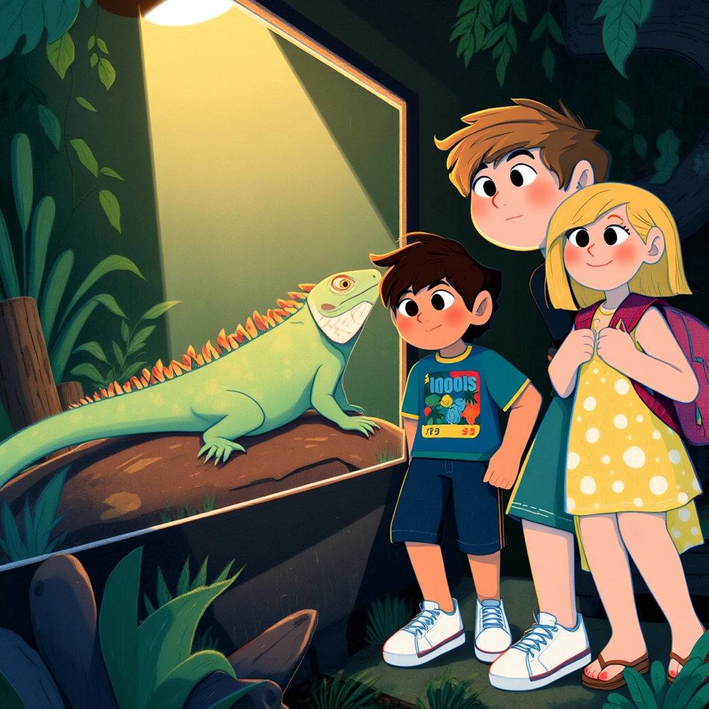 Inside the reptile house, they found a giant green iguana lounging on a warm rock. [Ben](TW5Z2WK4) gasped, 'Look at its tail—it goes on forever!' [Greta](9TGJ4HMP) added, 'Its skin looks like dragon scales. Do you think it's magical?' [Ben](TW5Z2WK4) grinned, 'Only if we ask nicely!'