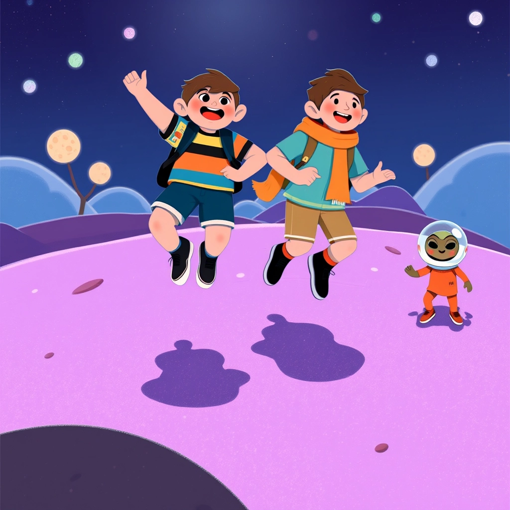 [Zibble](5ZRV3TJN) showed them how to jump super high on the planet's bouncy surface. 'Boing!' went [Ben](GH6JF3VF). 'Boing-boing!' laughed [Joe](SG7M9Y6Z). They felt like astronauts on a trampoline!