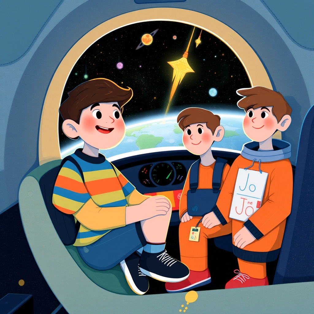 The rocket ship spoke in a cheerful voice: 'Hello, adventurers! Would you like to journey to space?' [Ben](GH6JF3VF) and [Joe](SG7M9Y6Z) looked at each other and nodded excitedly. In no time, they buckled up and the countdown began—3, 2, 1... Blast off!
