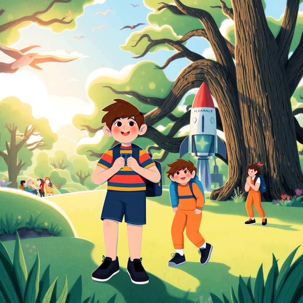 [Ben](GH6JF3VF) and [Joe](SG7M9Y6Z) loved to dream about space. One sunny afternoon, as they played in the park, they spotted something unusual—a sparkly, silver rocket ship parked right behind a tall oak tree!