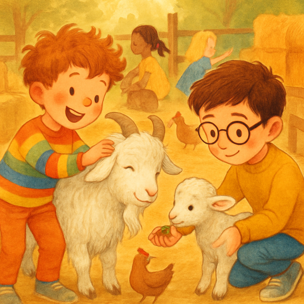 Their final stop was the Petting Zoo. [Ben](TW5Z2WK4) brushed a fluffy white goat while [Kieron](QJ9MGPSW) timidly fed grain to a friendly lamb. 'This is so much fun!' [Ben](TW5Z2WK4) said with a smile.