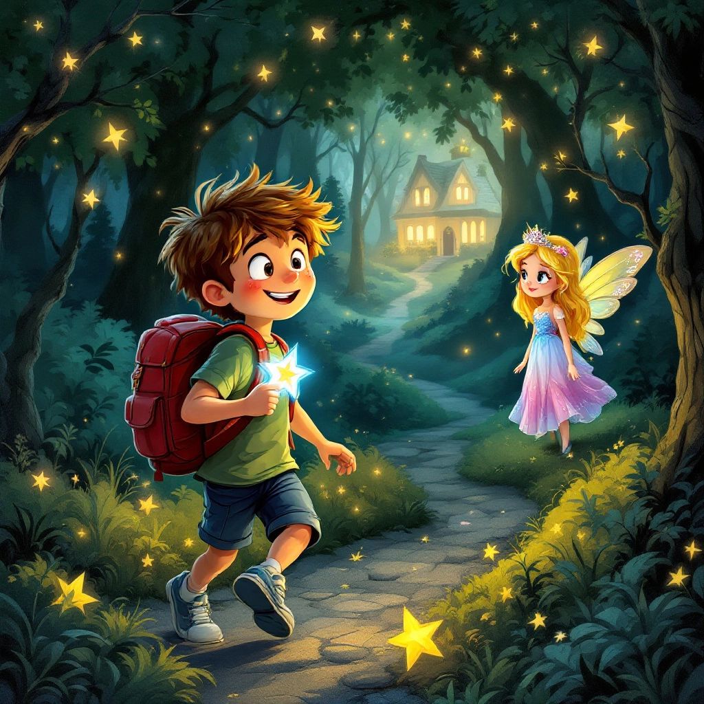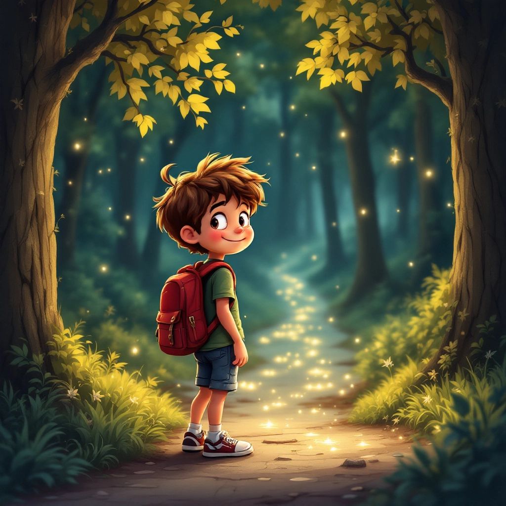[Ben](TVRYP4DF) loved to explore the woods behind his house. One sunny afternoon, as he walked deeper than ever before, he stumbled upon a sparkling path lined with glowing, golden leaves.
