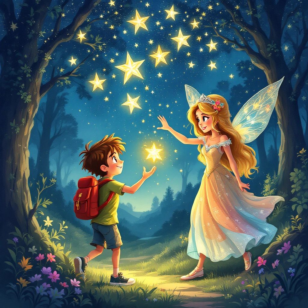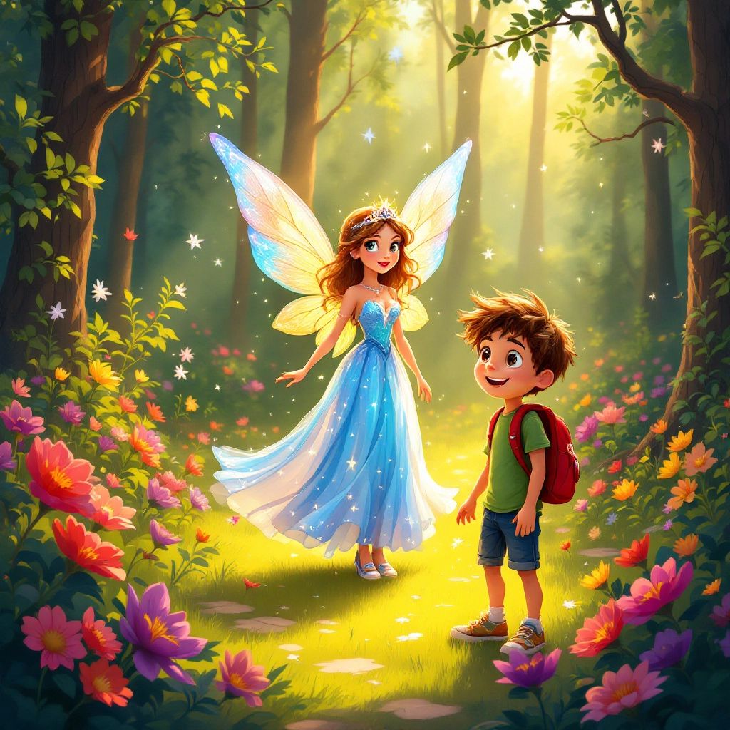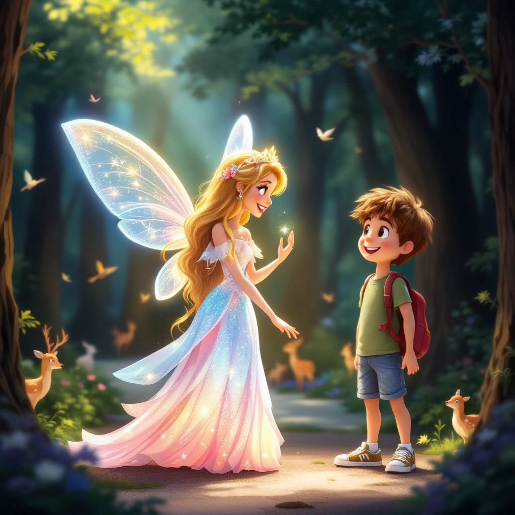 As [Ben](TVRYP4DF) followed the path, the glowing trees opened up into a clearing, and he saw a beautiful fairy princess. She had shimmering wings and wore a dress that sparkled like the stars.