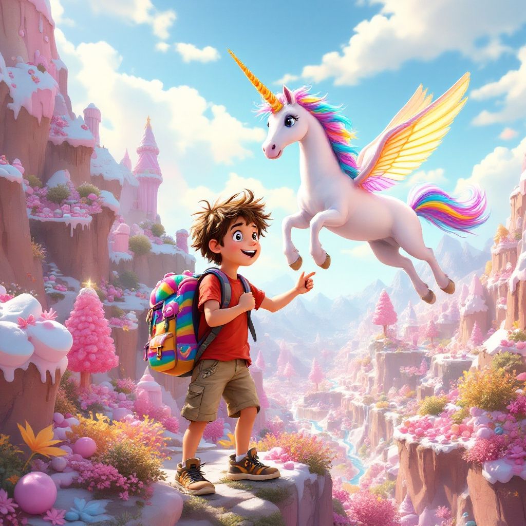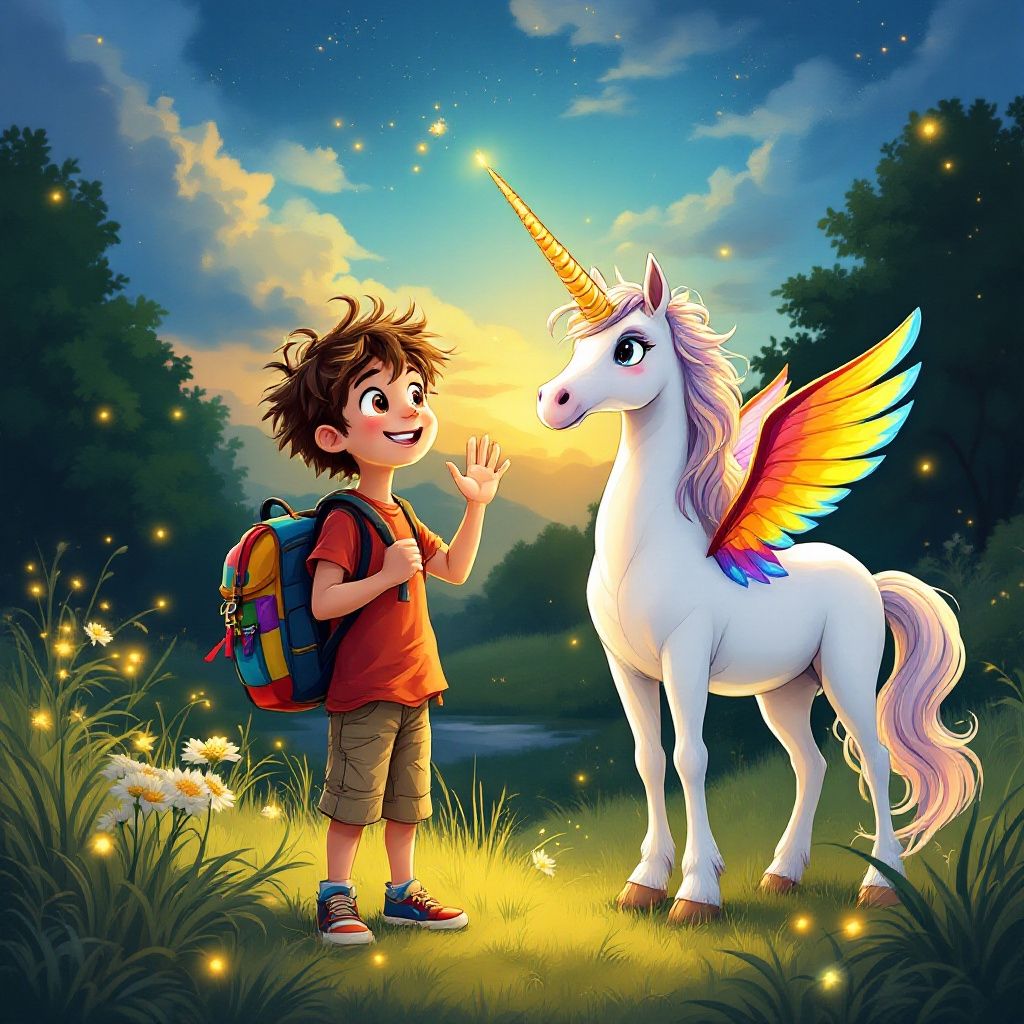 While playing, he saw something shimmering in the sky—it was a flying unicorn with rainbow-colored wings!