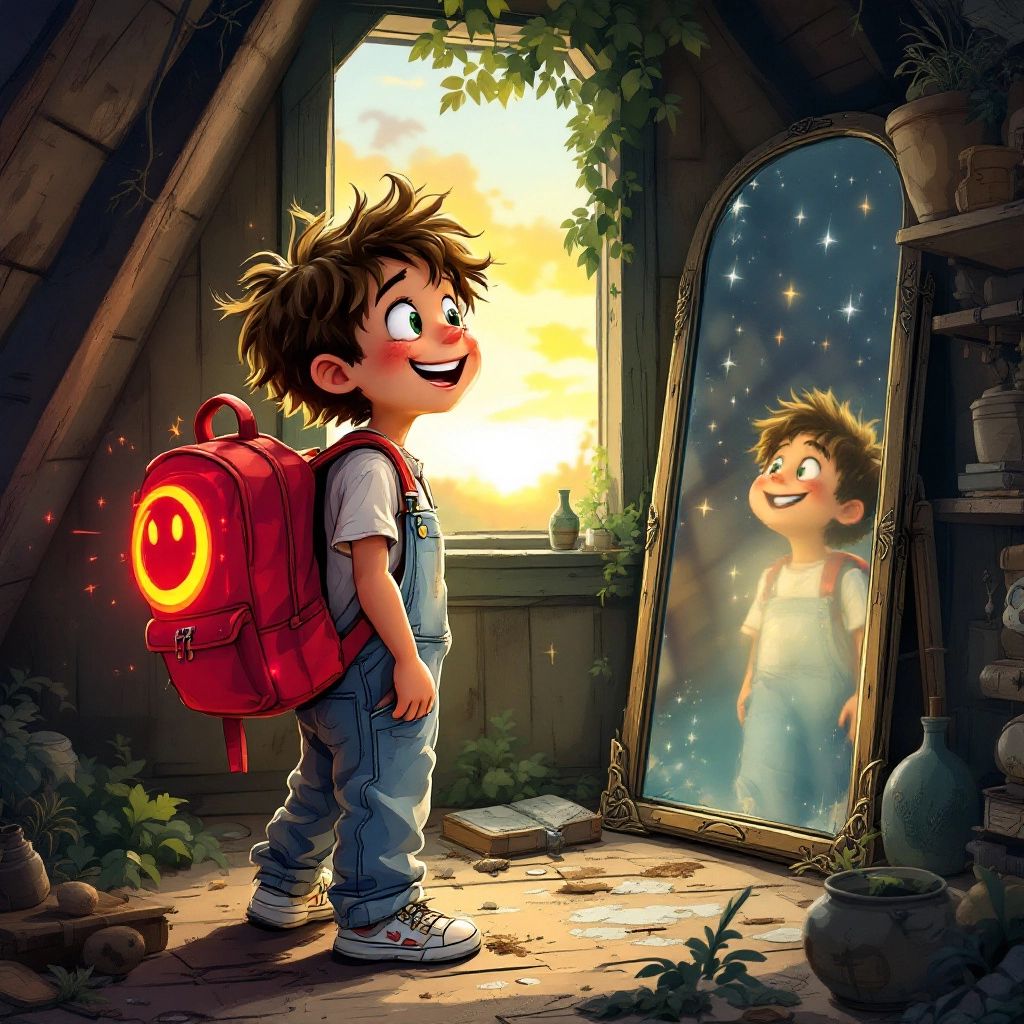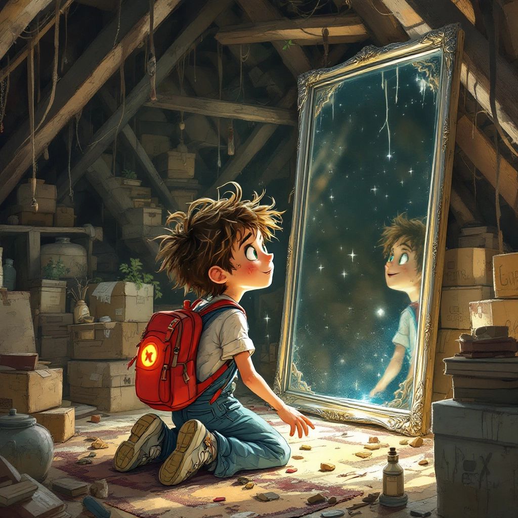 Back in the attic, the mirror was restored to its full glory, its surface shining brighter than ever. ‘Now you can explore countless worlds whenever you’re ready,’ [Lorelai](4C7YGS3Q) whispered through the mirror. [Ben](XBH9KXY4) beamed, knowing this was just the beginning of his adventures.