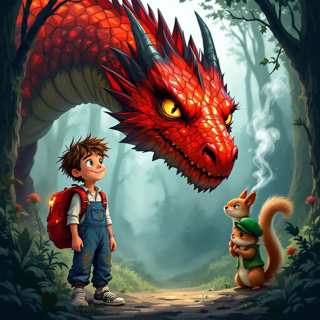 With [Nutty](QWS3JC3L) perched on his shoulder, [Ben](XBH9KXY4) ventured deeper into the woods. They encountered a fierce but friendly dragon named [Ember](6YDH7TBV) with ruby-red scales that shimmered in the sunlight. [Ember](6YDH7TBV) offered to take them to the legendary Mountain of Stars where the shards might be found.