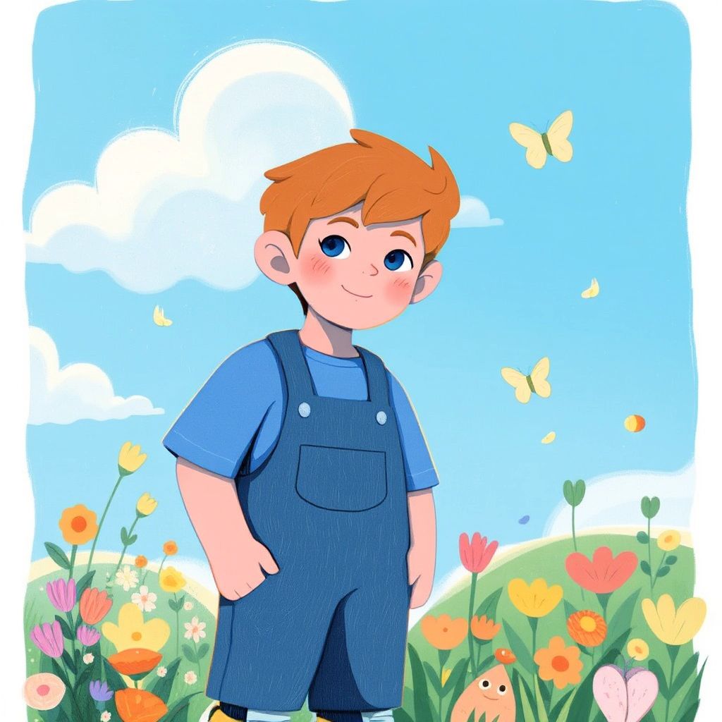 One sunny afternoon, [Ben](Y3NVZYX9), adventurously curious with his bright blue eyes, found himself wandering in the enchanting meadow near his home. He wore his favorite blue t-shirt and denim overalls, ready for any adventure that might come his way.