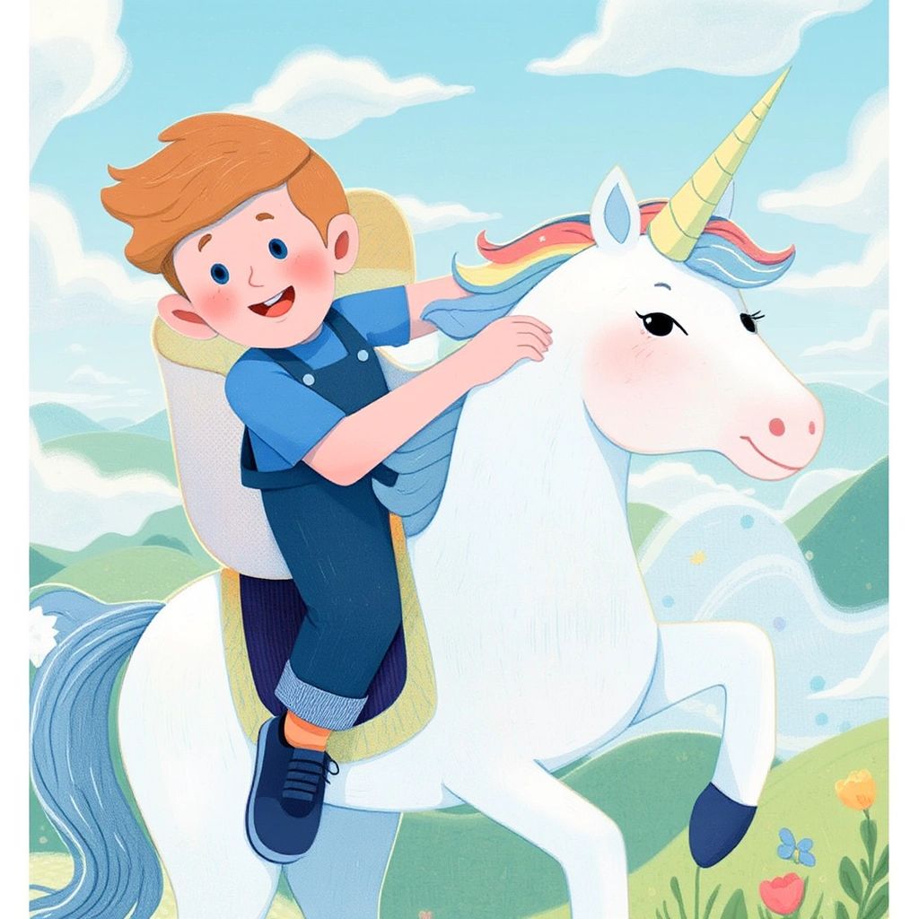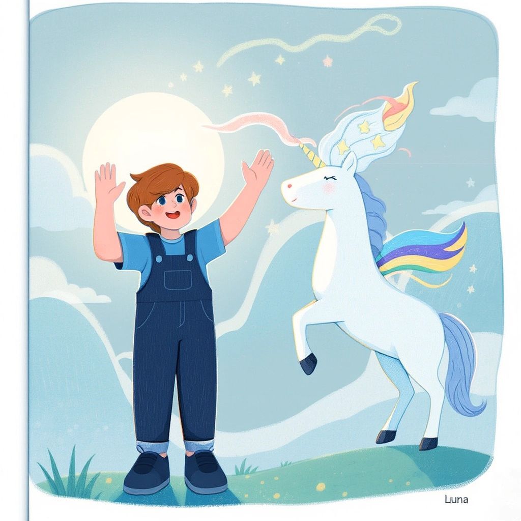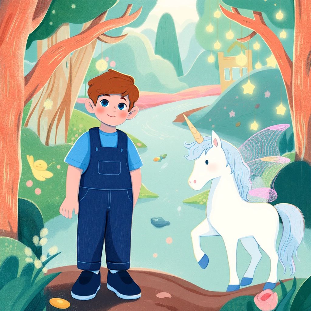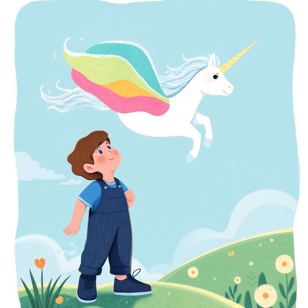 As [Ben](Y3NVZYX9) explored, he heard a gentle whooshing sound. Looking up, he was astonished to see a dazzling unicorn with a shimmering silver mane and rainbow-colored wings gliding gracefully above.