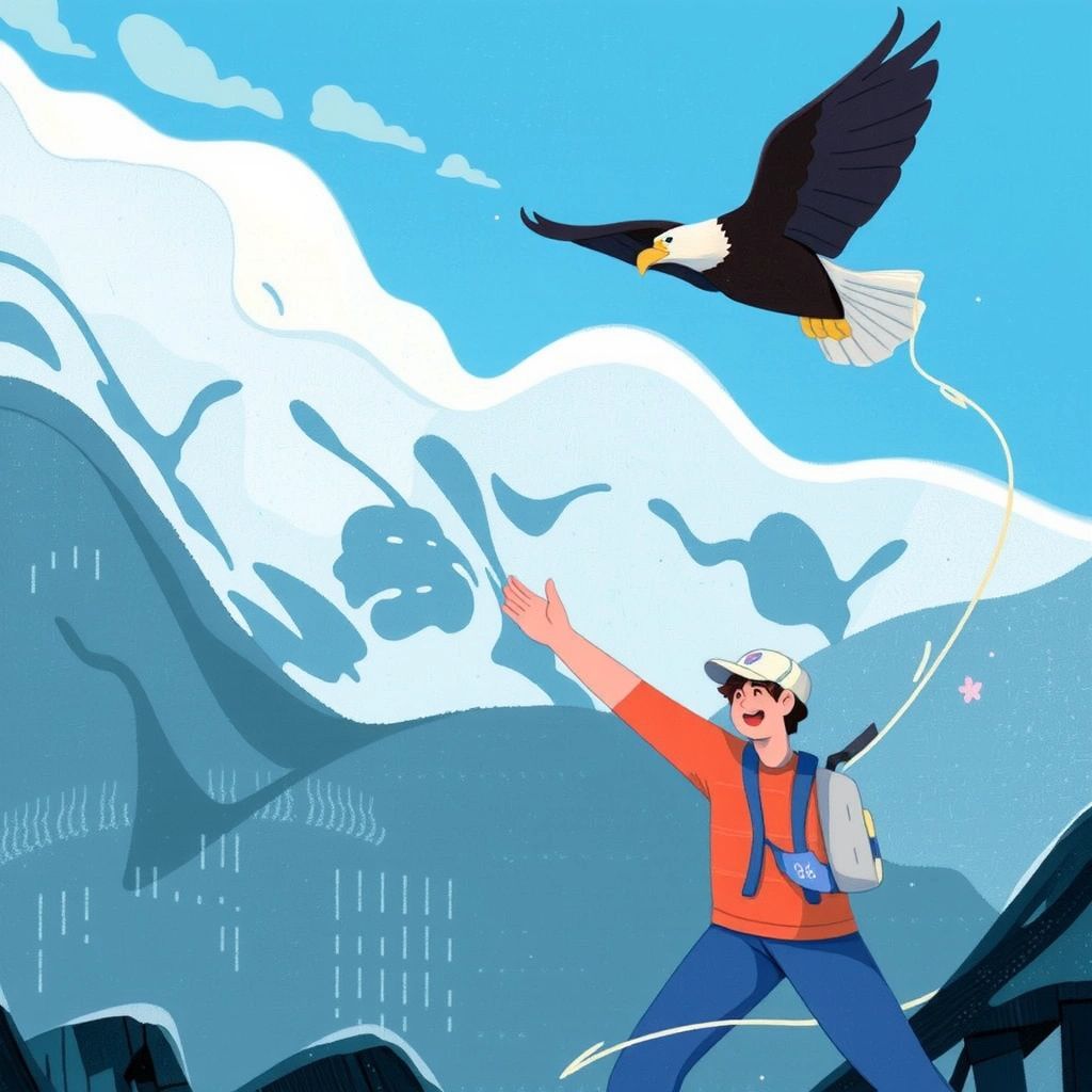 He even passed a giant mountain where eagles soared. "Hello there!" he yelled, feeling as free as a bird.