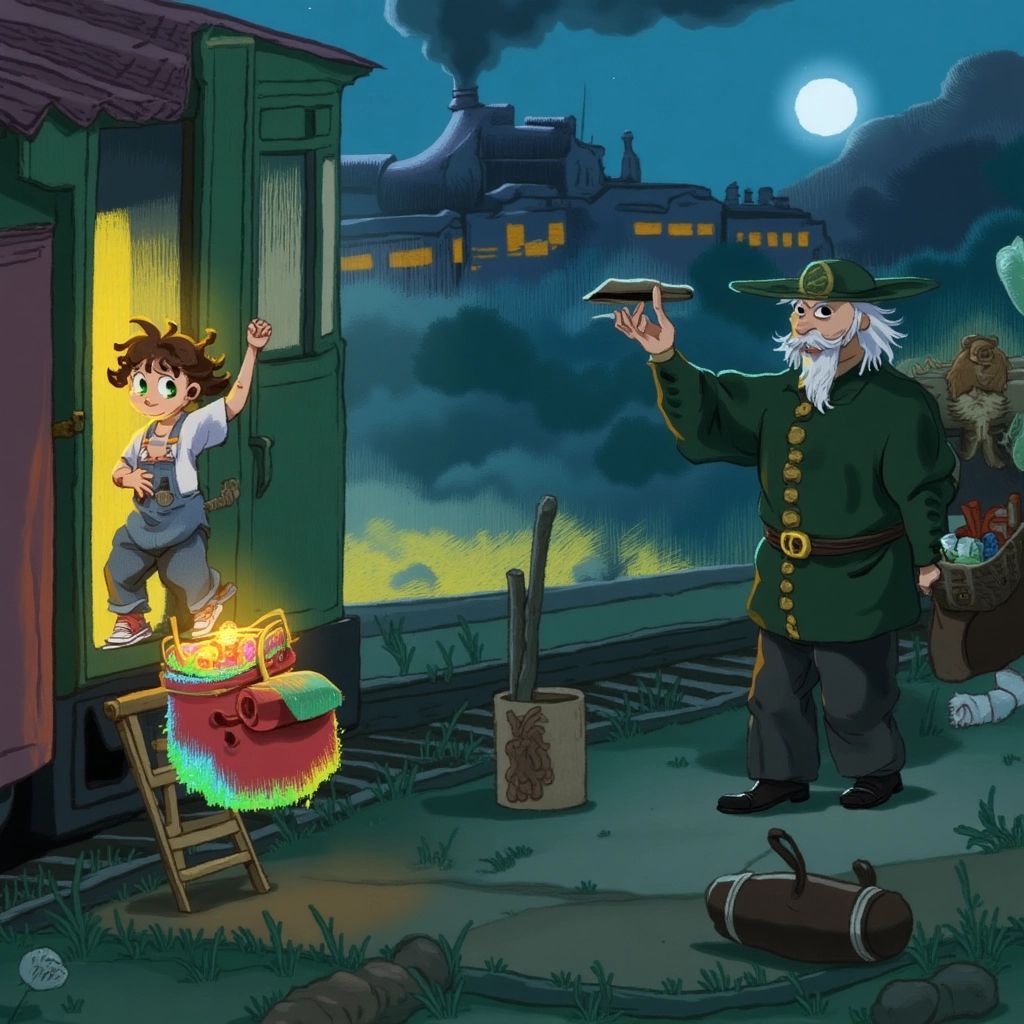 [Ben](XBH9KXY4) arrived at the edge of the woods. The Midnight Train stood tall and glimmering on tracks that hadn’t been there before. Its carriages shimmered with silver patterns, and its headlights glowed like twin moons. An old conductor with a kind smile motioned towards [Ben](XBH9KXY4). 'You’re just in time for an adventure,' he said.
