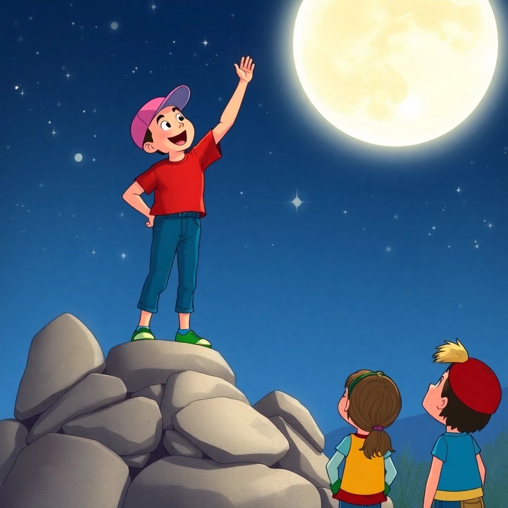 With the help of his friends, [Ben](Y3NVZYX9) climbed up high and whispered to the moon, ‘Let me give you a little push!’