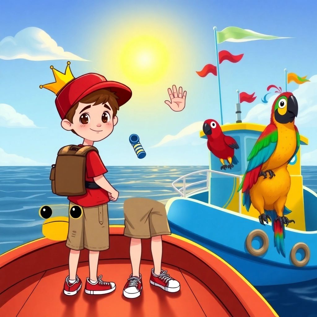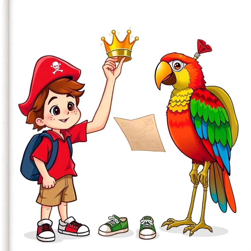 [Ben](FZ339XH5) opened the treasure chest and gasped! Inside were gold coins, sparkling jewels, and… a crown! "You’ve found it! You're the new Pirate King!" cheered a voice. [Ben](FZ339XH5) turned and saw a talking parrot.
