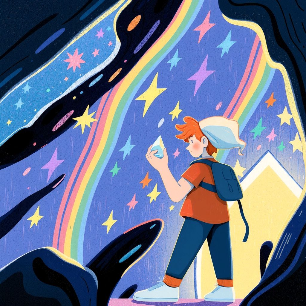 Lila led [Ben](FZ339XH5) to the Crystal Caverns, where the walls sparkled like stars and rainbows danced in the air. Together, they found a hidden gemstone that mirrored every color.