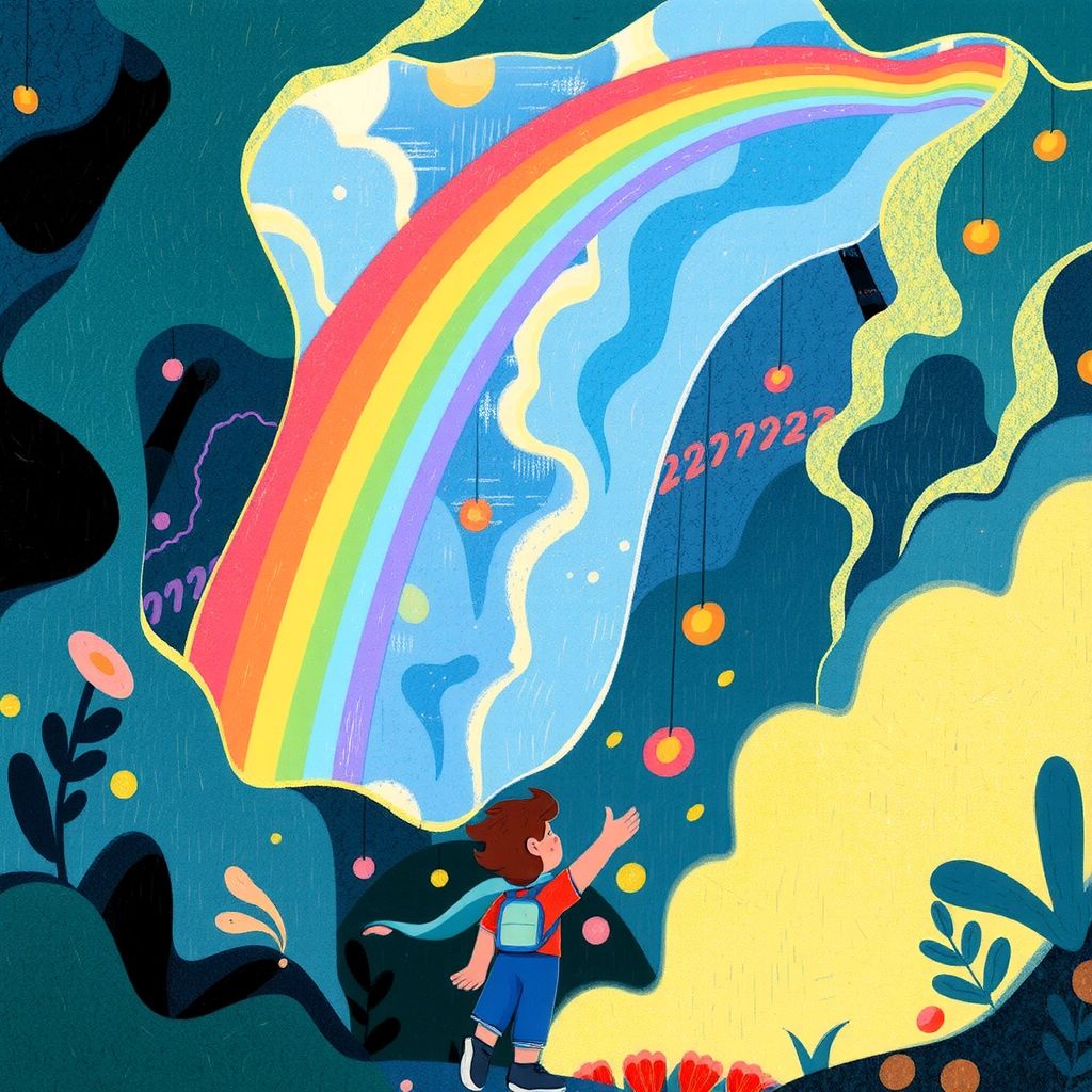 Excitedly, [Ben](FZ339XH5) followed the shimmering light through the forest until he stumbled upon a spectacular rainbow bridge. It arched high into the sky, vibrant colors glowing with an irresistible charm.