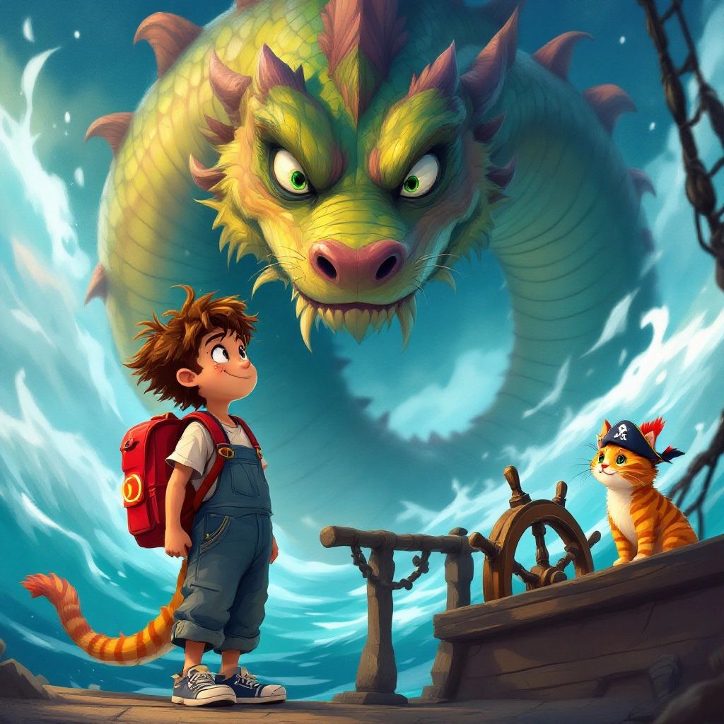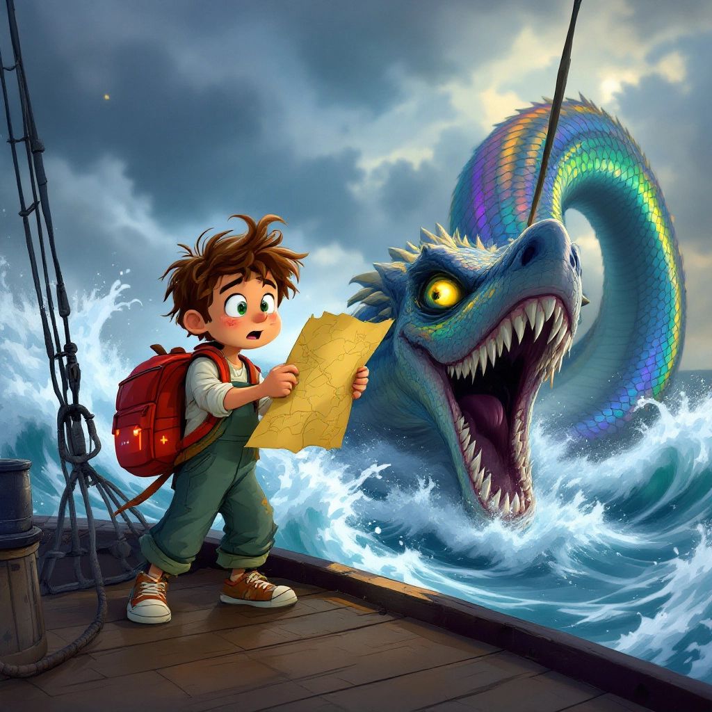 As they sailed, they encountered strong winds and waves. Suddenly, a sea serpent with scales that shimmered like rainbows appeared, guarding the way to Treasure Island.