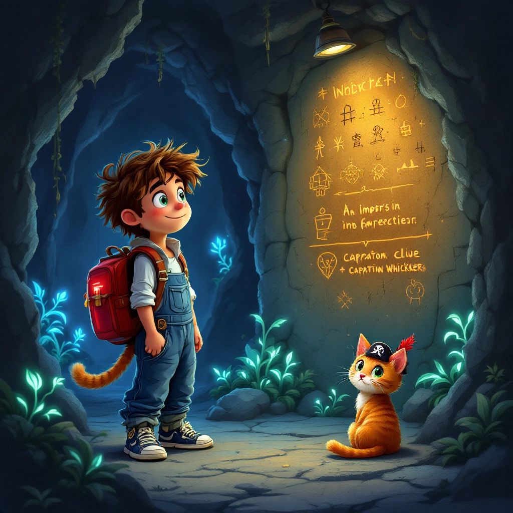 Inside the cove, [Ben](XBH9KXY4) found a series of puzzles engraved on the walls. He solved each one with help from [Captain Whiskers](G3TV4GB4), who pointed out clues with his tail.
