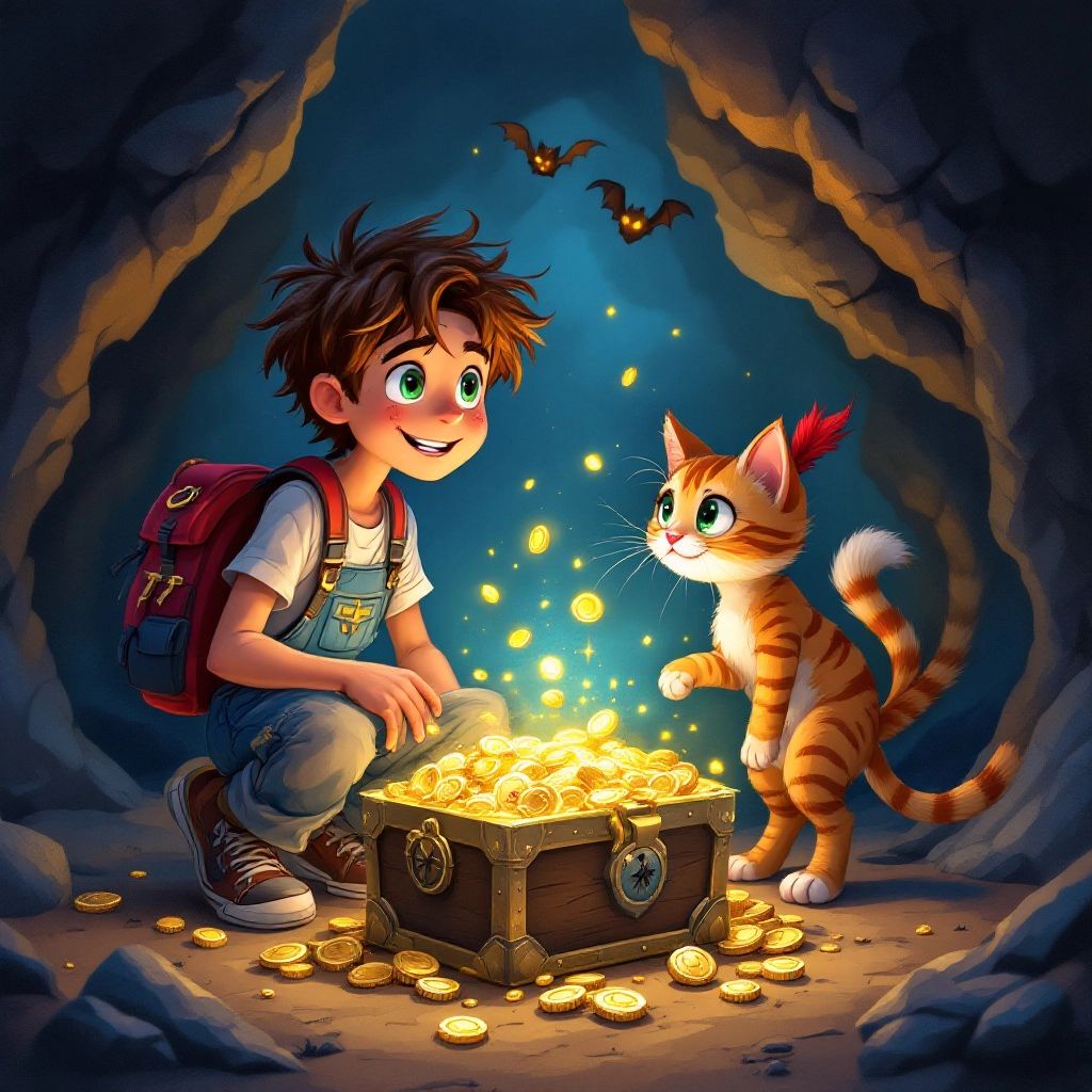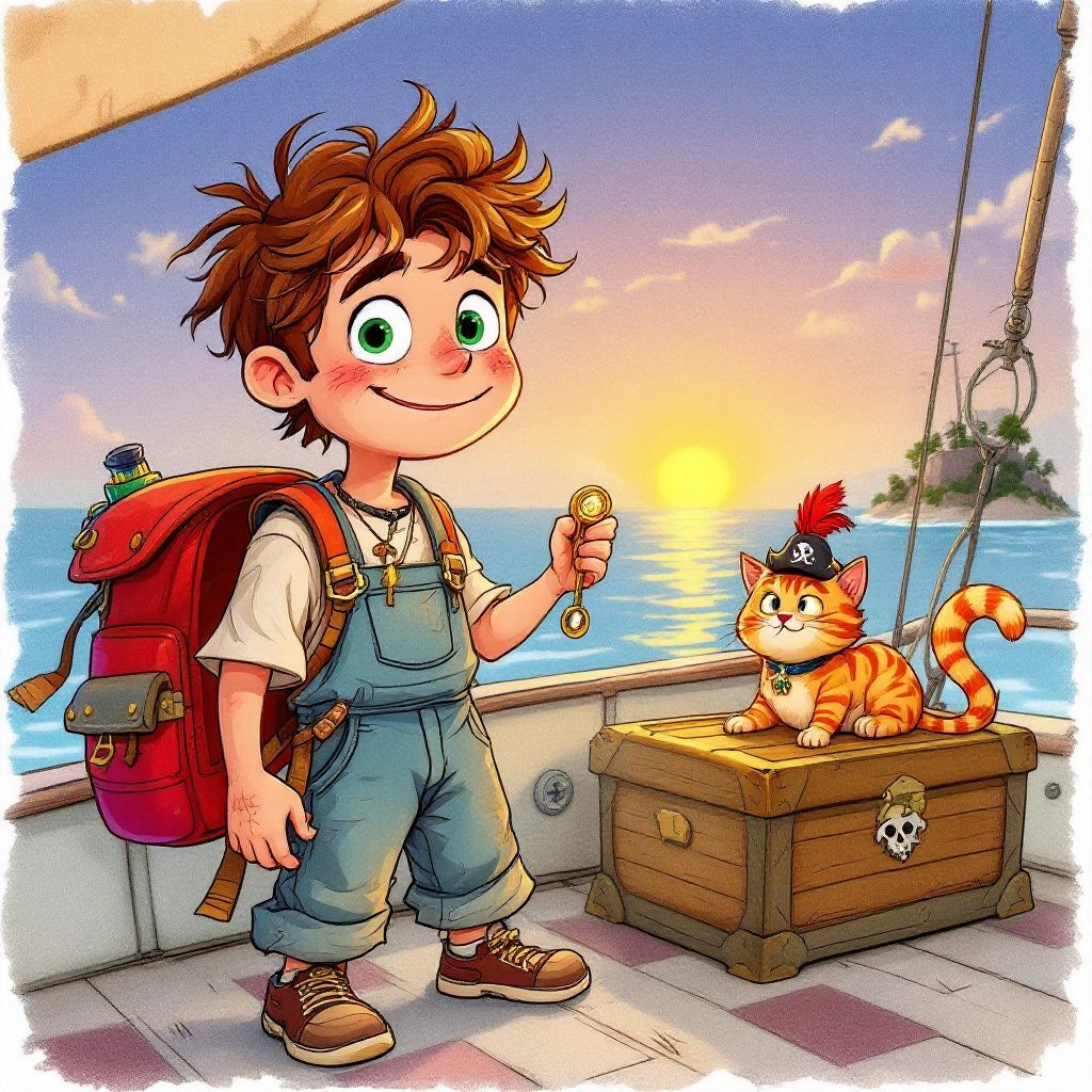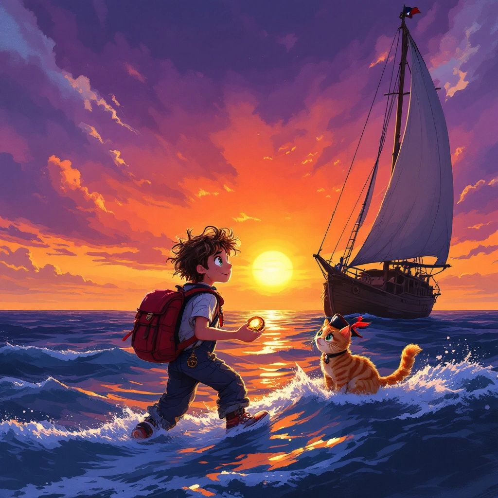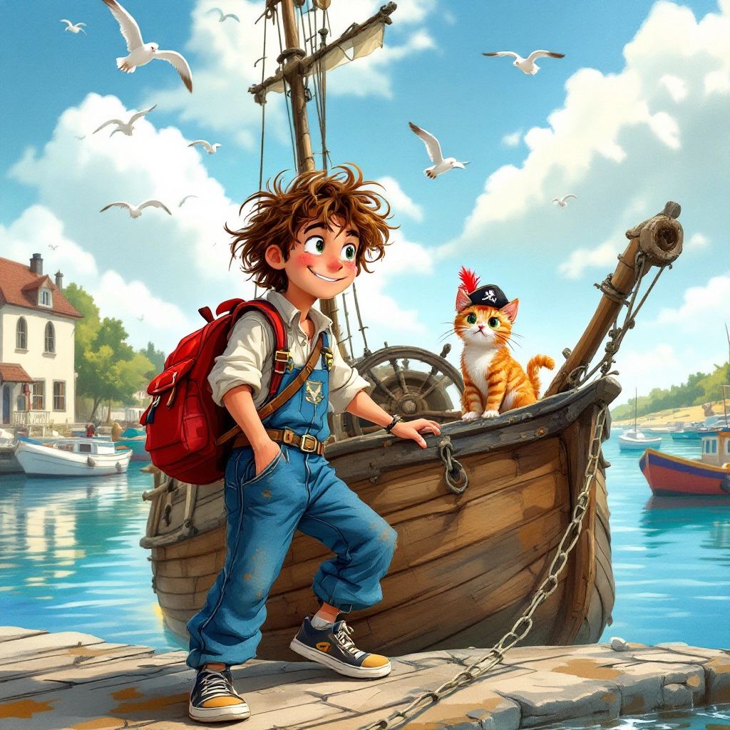 Down at the harbor, [Ben](XBH9KXY4) found an old pirate ship named The Seagull. With the help of [Captain Whiskers](G3TV4GB4), a mischievous, hat-wearing cat, they set off on their adventure.