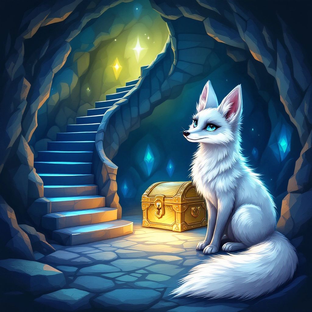 The staircase spiraled down into a spacious chamber lit by the soft light of crystals. In the center, a treasure chest gleamed. But guarding it was a sly-looking mountain fox with silver fur and bright blue eyes.
