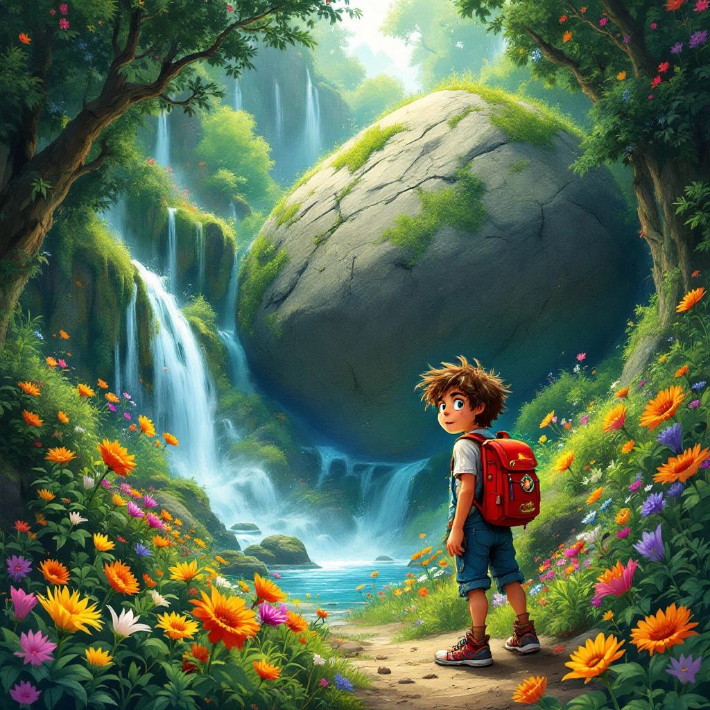 The valley was enchanting. Waterfalls cascaded from high cliffs, flowers bloomed in every color, and the air felt alive with magic. Suddenly, the ground rumbled, and [Ben](XBH9KXY4) saw a huge boulder rolling toward him!