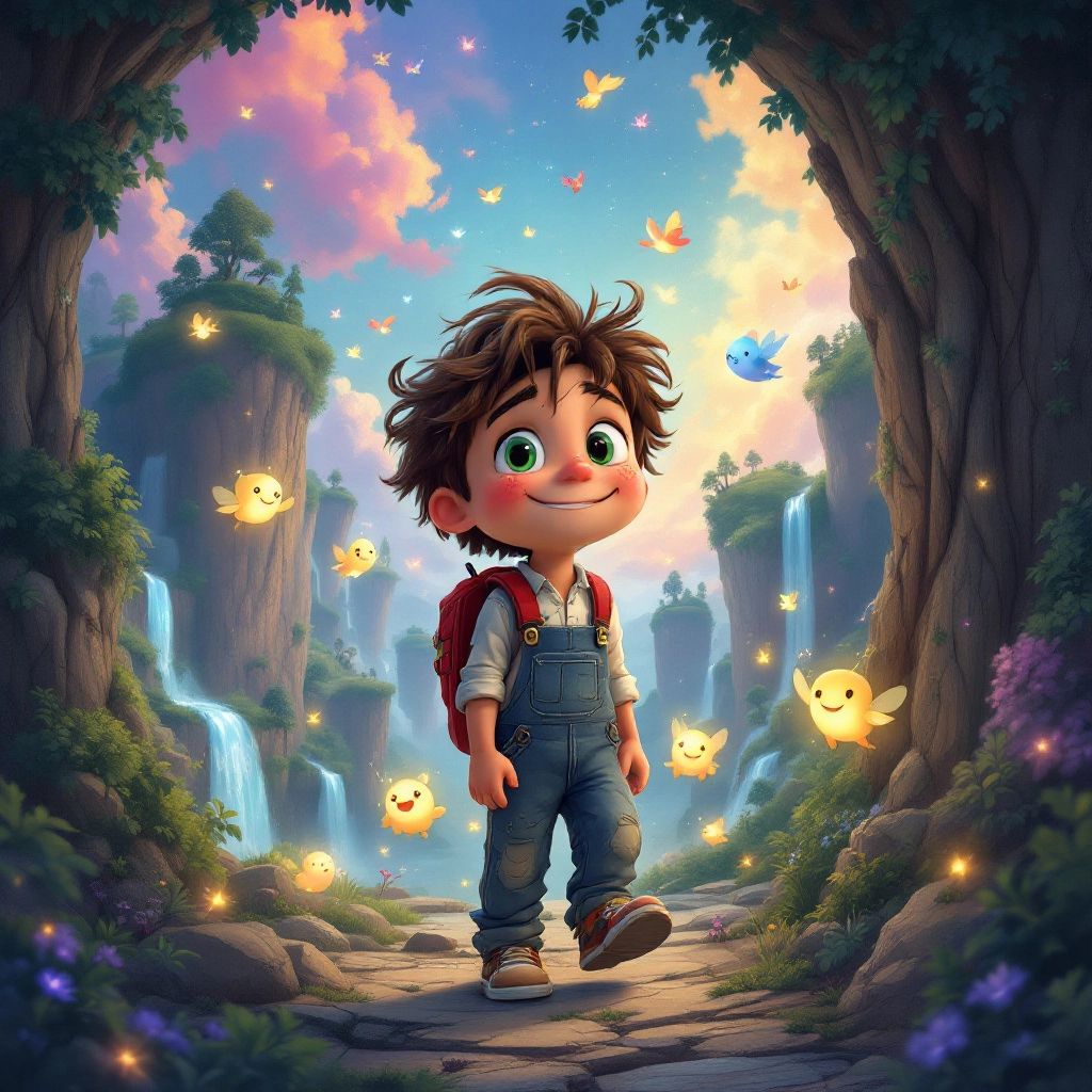The door swung open, leading to an incredible sight: a magical world filled with floating islands, shimmering waterfalls, and skies swirled with pink, purple, and gold clouds. [Ben](XBH9KXY4) gasped in amazement as colorful birds sang and tiny floating creatures buzzed by, welcoming him.