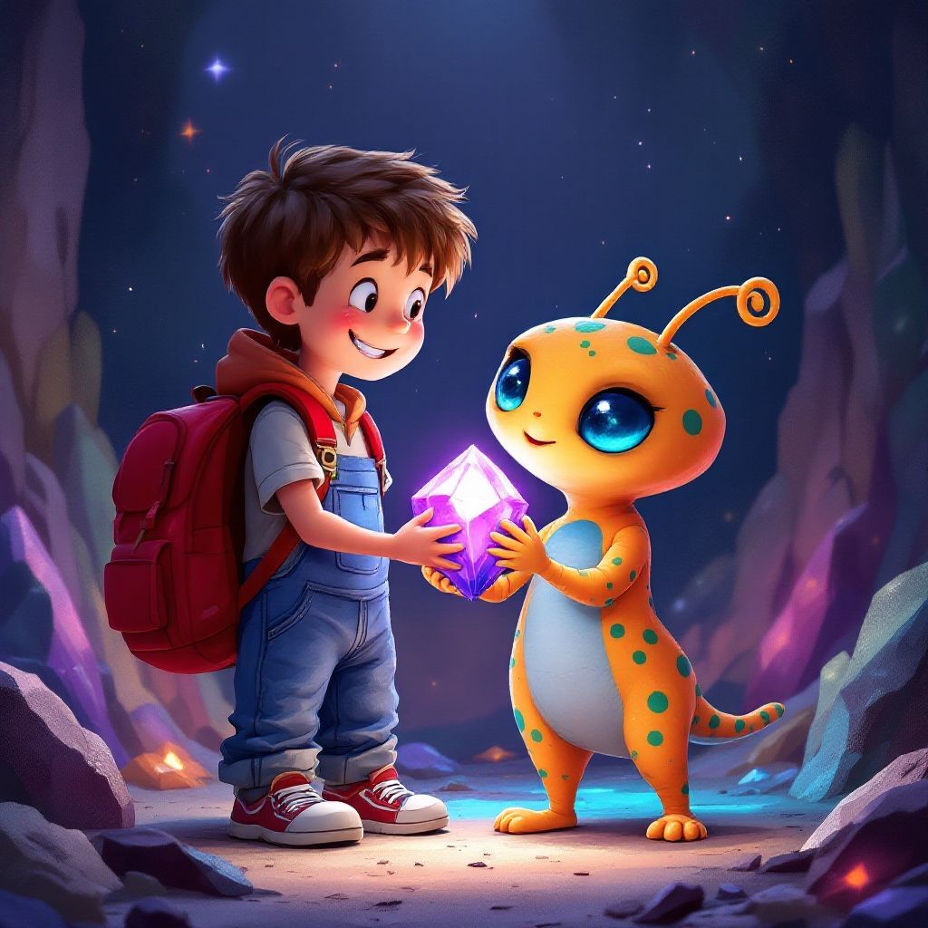 [Zogo](W9XXC2S3) explained, 'I lost my zoomi-crystal, without it, my spaceship won’t fly! Can you help me find it?' [Ben](XBH9KXY4) nodded immediately. 'Let’s search together!'