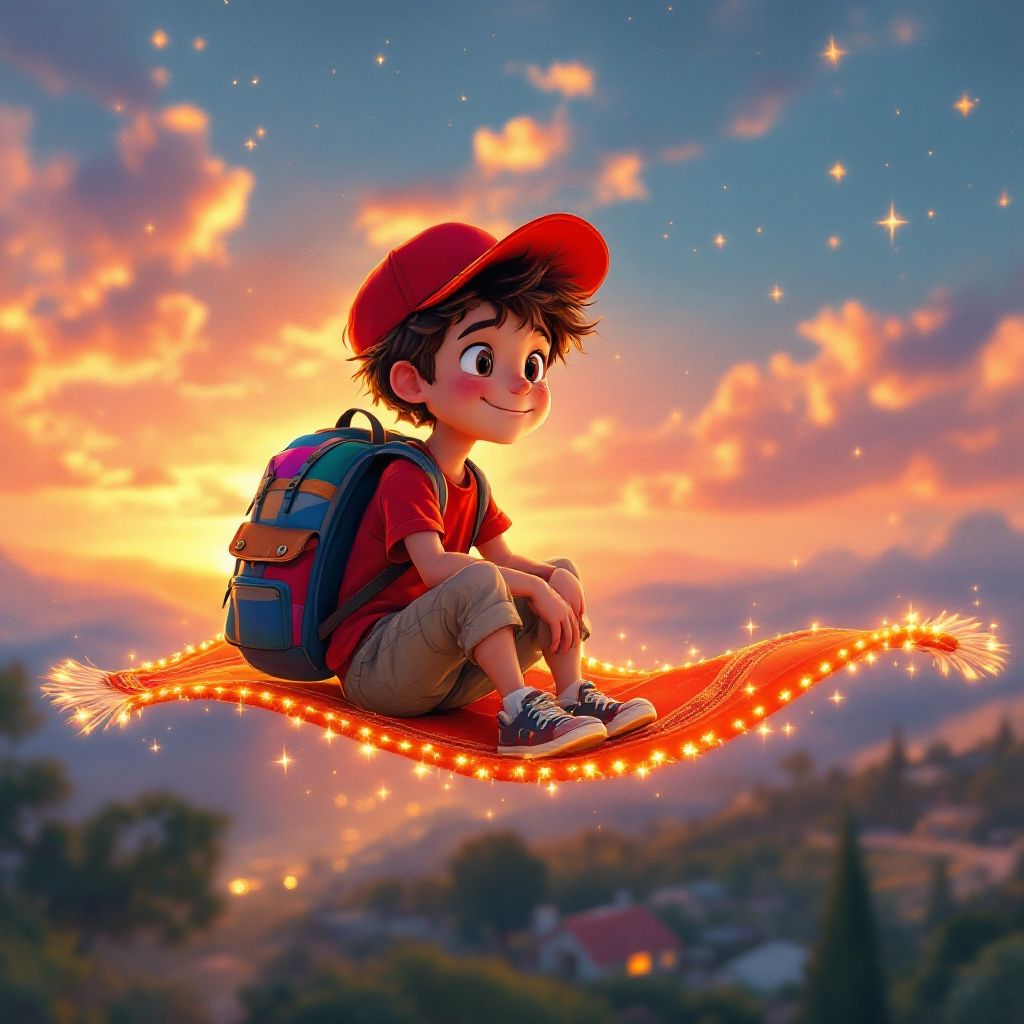 As [Ben](FZ339XH5) sat on the glowing carpet, it wiggled under him and WHOOSH! Up into the sky they went! [Ben](FZ339XH5) laughed, waving to birds as they passed fluffy clouds.