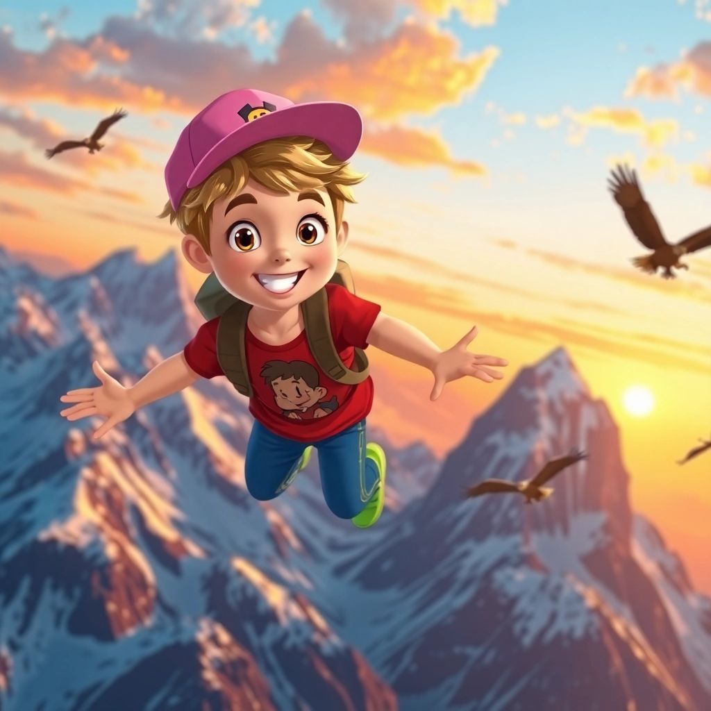 He soared over snowy mountains where friendly eagles flew alongside him, guiding the way.