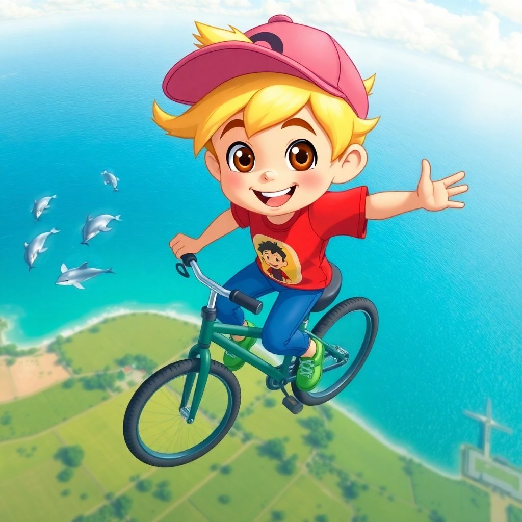 The next day, [Ben](Y3NVZYX9) put on his quirky pink cap and vibrant green shoes, climbed onto his bicycle, and whoosh, up he went into the sky!