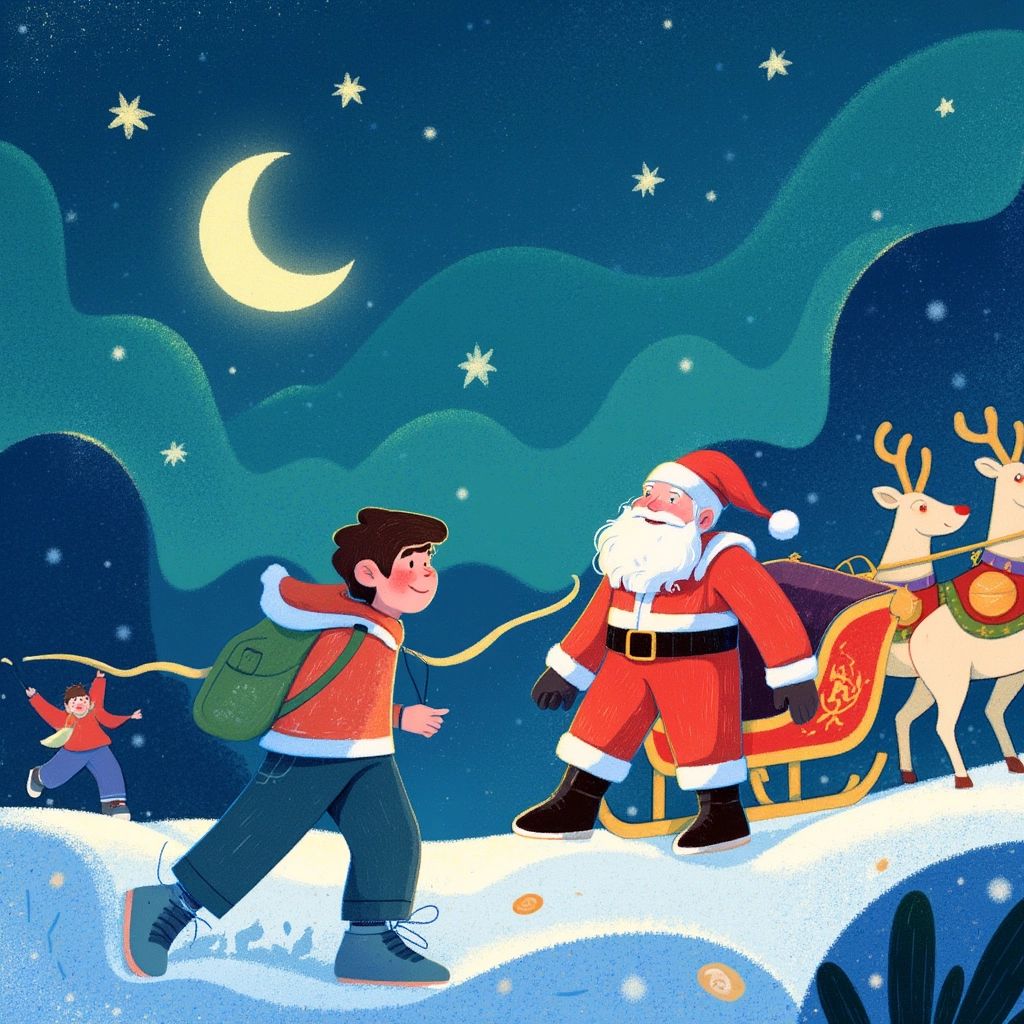 That night, [Ben](FZ339XH5) stood in awe as [Santa](69XXNPWF)'s sleigh, radiant with glittering gold and ruby-red ornaments, awaited. The reindeer pawed at the snow eagerly, their harnesses jingling like chimes across the icy air. Each one had a unique personality and greeted [Ben](FZ339XH5) warmly.