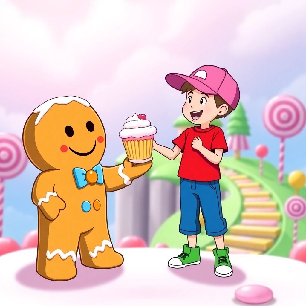 On Candy Island, [Ben](Y3NVZYX9) met a jolly gingerbread man named Gus who shared his marshmallow cupcakes.
