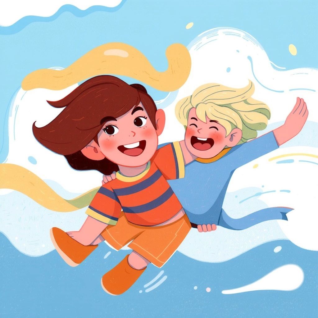 [Ben](Y3NVZYX9) met [Whirl](QTL36W6T), the playful wind-boy, who taught him cloud-sliding. "Wheee!" laughed [Ben](Y3NVZYX9).