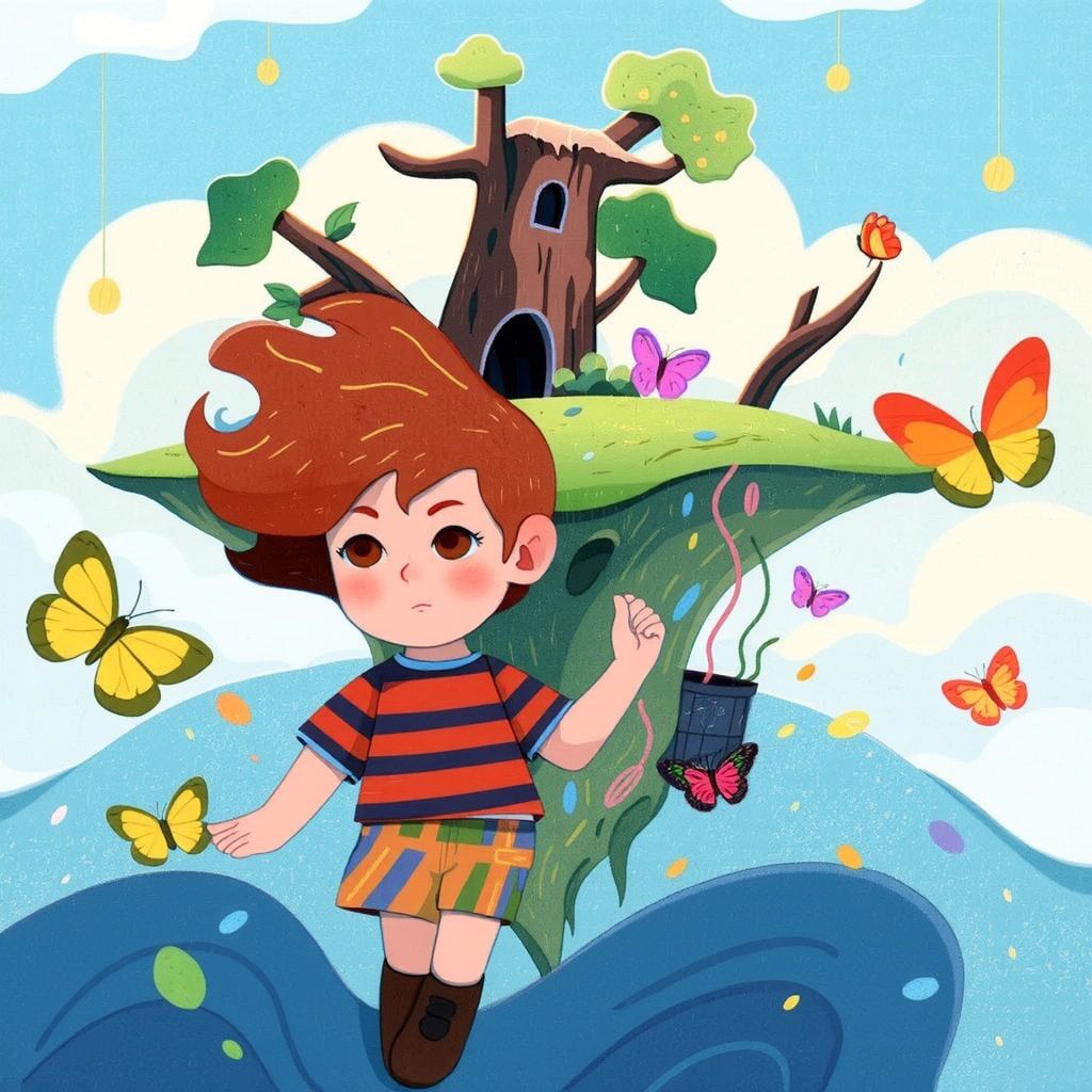 They floated to a magical island, where trees grew upside-down and butterflies fluttered in rainbow colors.