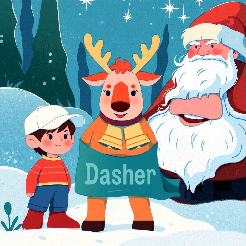 The reindeer introduced himself as [Dasher](LDQD4D92) and told [Ben](FZ339XH5) about his special task tonight—to take [Ben](FZ339XH5) to [Santa](69XXNPWF)'s magical workshop at the North Pole!