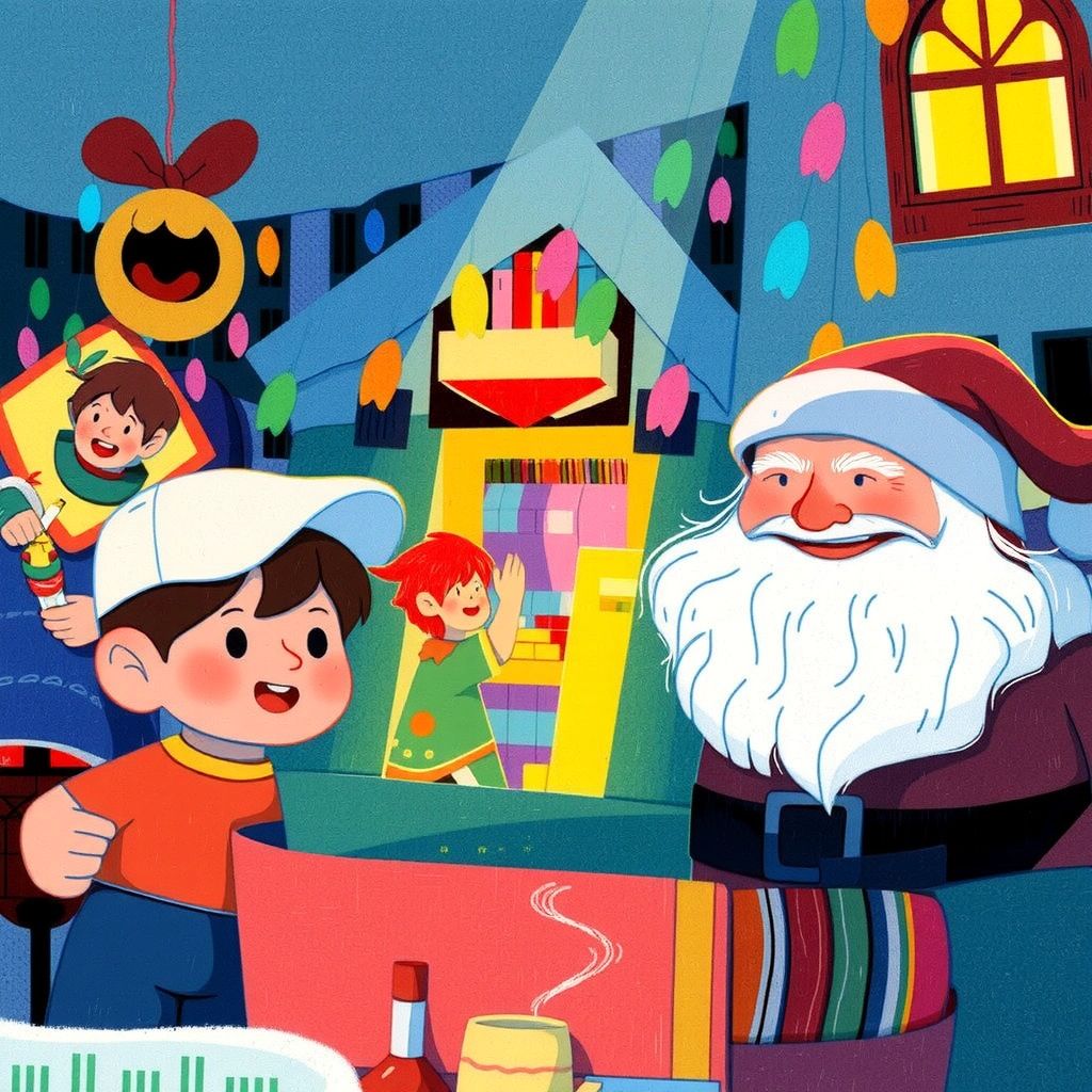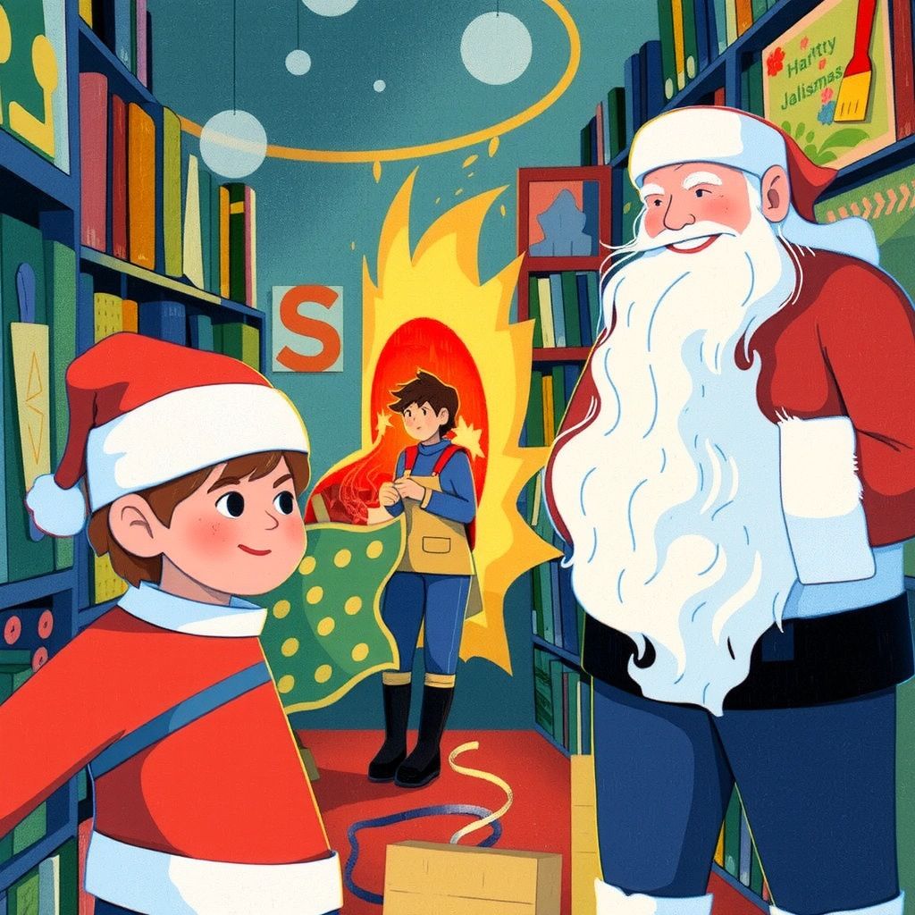 [Santa](69XXNPWF) greeted [Ben](FZ339XH5) with a warm smile, showing him around the workshop. [Ben](FZ339XH5) marveled at toys being made and learned about sharing kindness and joy.