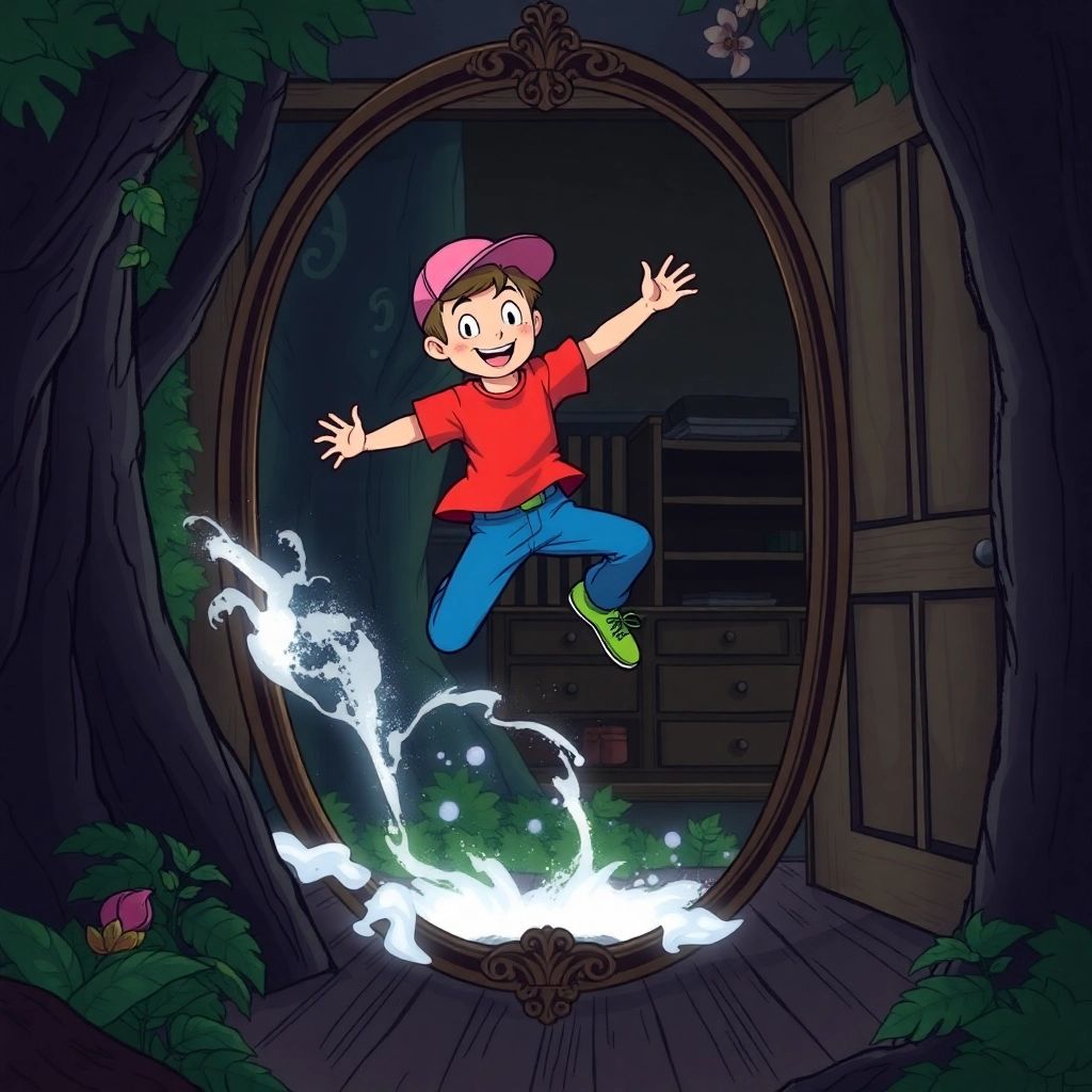 Without thinking, [Ben](Y3NVZYX9) reached out to touch the mirror. To his surprise, his hand went right through! Before he knew it, he was pulled into the magical world he had seen.