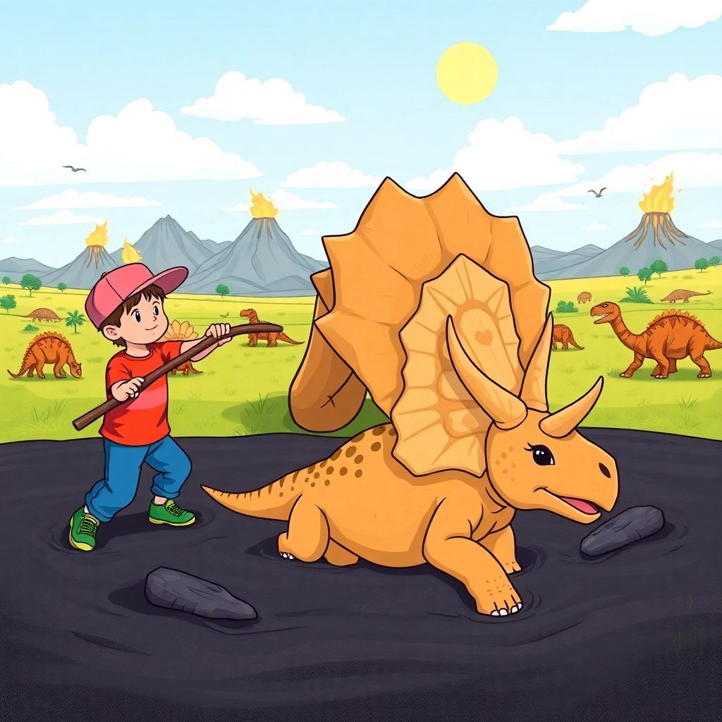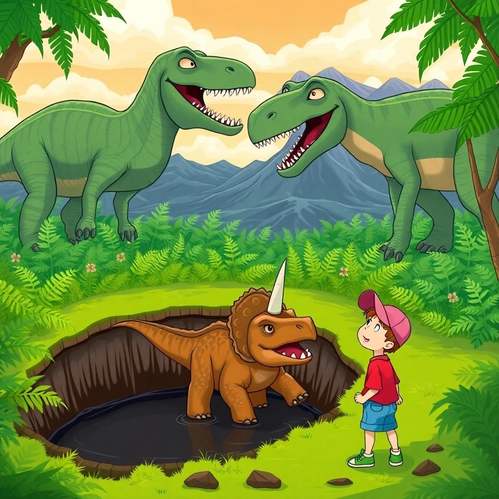 Suddenly, [Ben](Y3NVZYX9) found himself in the age of dinosaurs! He marveled at the behemoth creatures but quickly realized a baby dinosaur was stuck in tar!