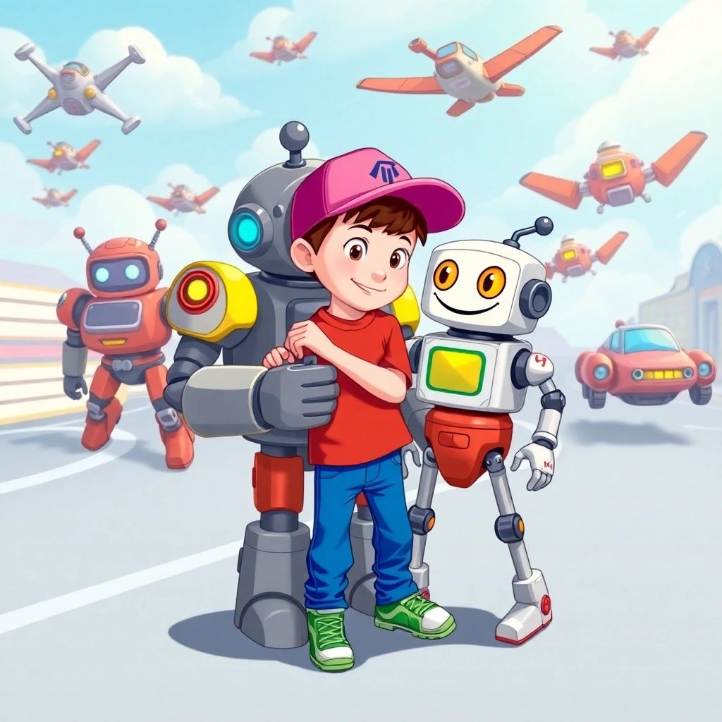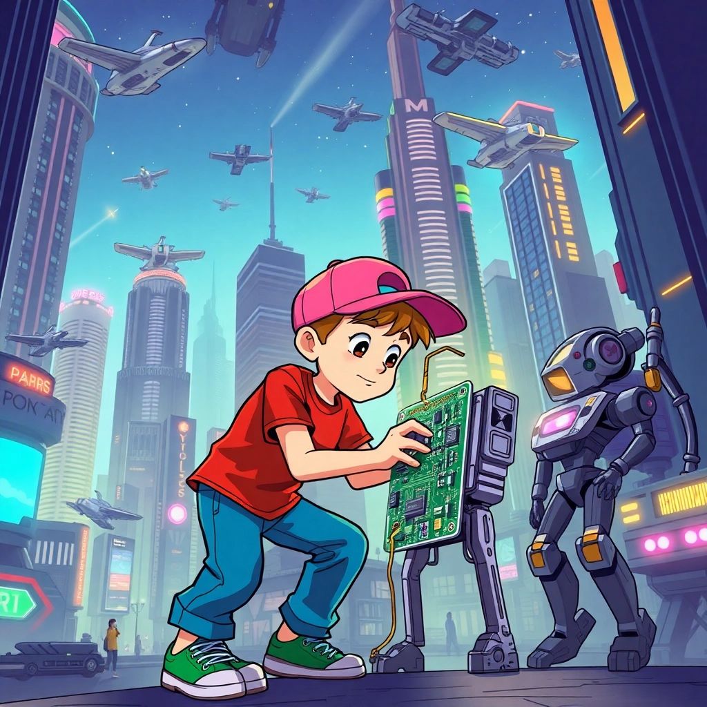 Finally, [Ben](Y3NVZYX9) arrived in the future, where flying cars and robots were everywhere! A friendly robot approached him, asking for help to fix a broken circuit.