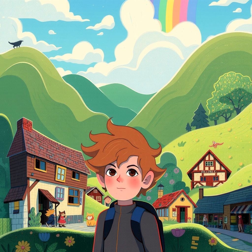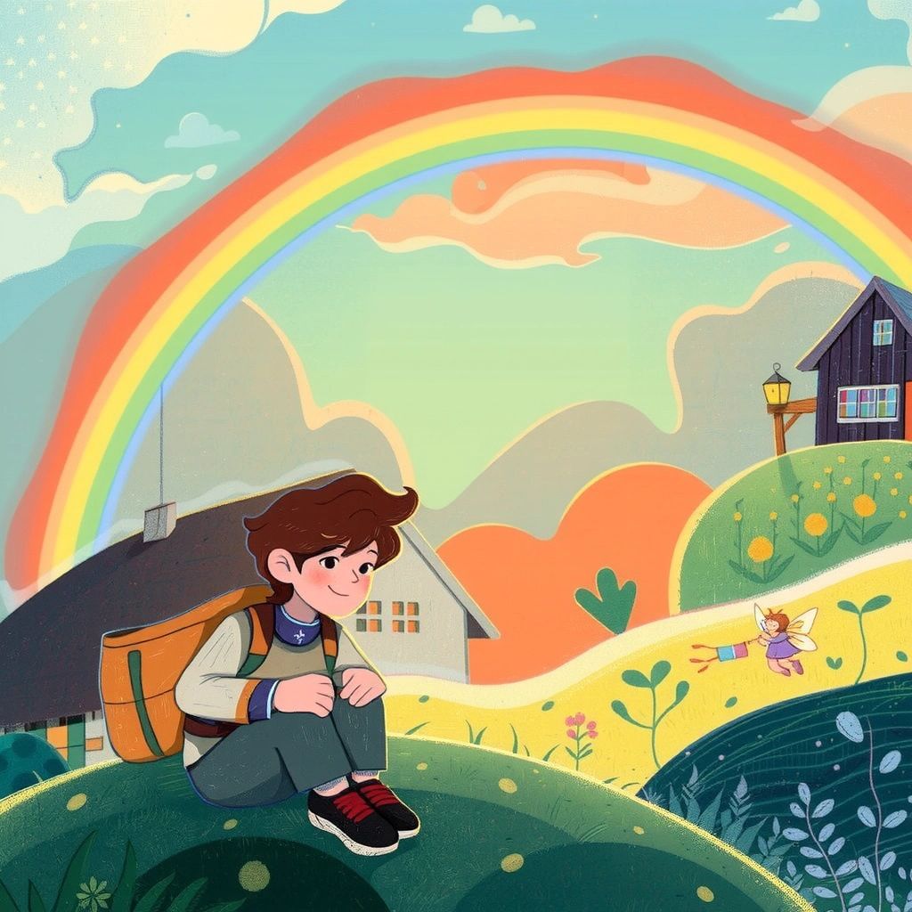Once upon a time, in a serene little village, there lived a curious boy named [Benjamin](KCVJTLG6). This village was unlike any other, nestled between rolling hills and vibrant meadows. But something unusual had happened—the village rainbow had disappeared!