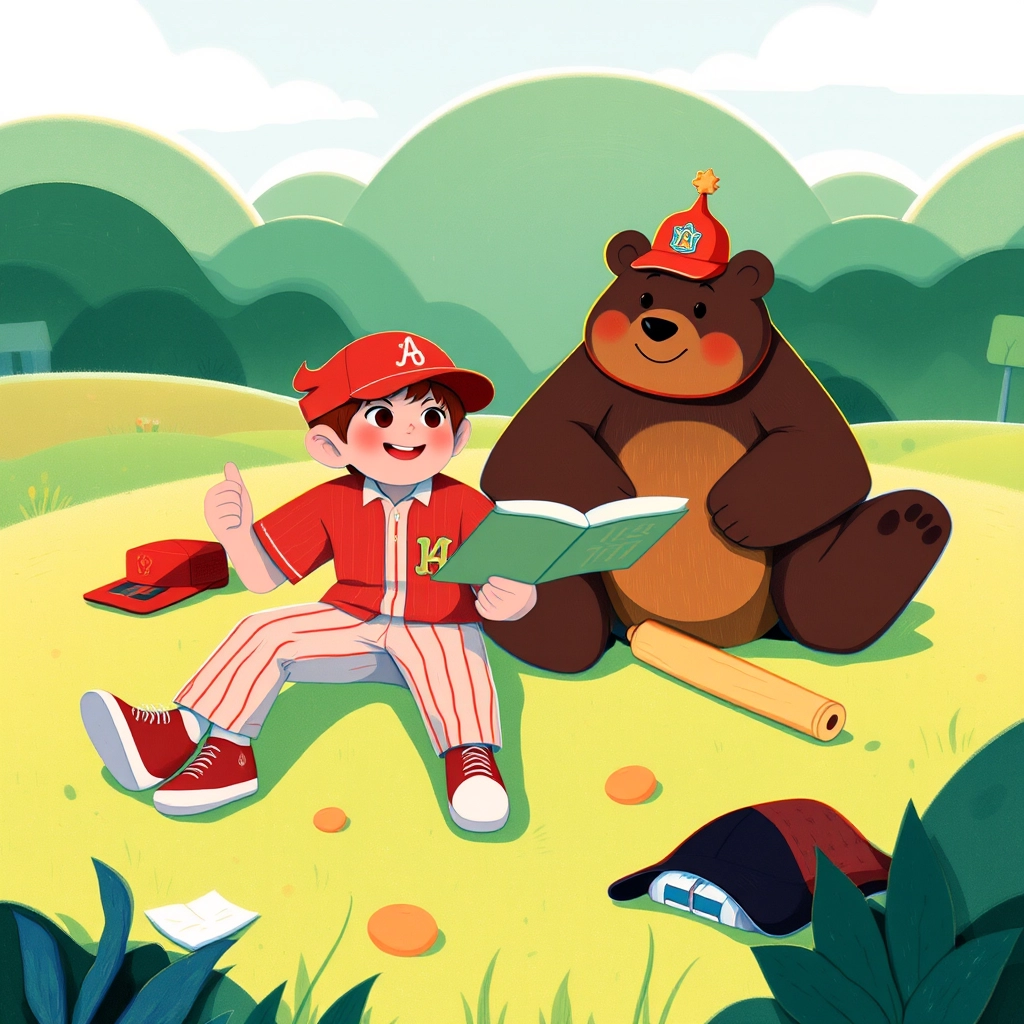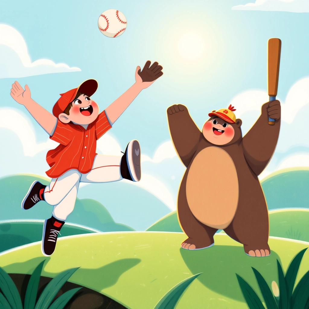 [Benny](72GTMGGP) and the bear made an amazing team. They promised to meet every afternoon for more baseball adventures. "We make a great duo!" [Benny](72GTMGGP) said happily.