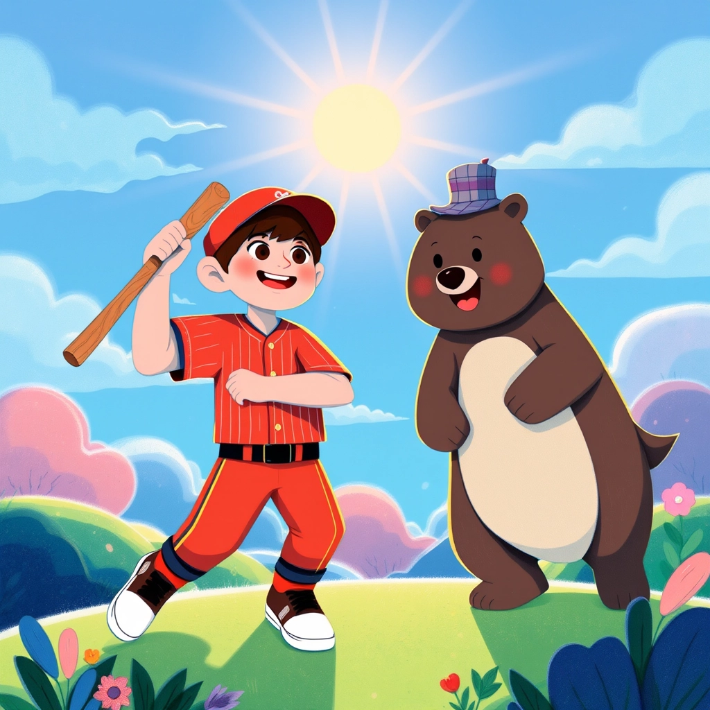 [Benny](72GTMGGP) decided to show the bear how to swing a bat. Although the bear was clumsy at first, his enthusiasm made [Benny](72GTMGGP) laugh as they practiced together under the sunny sky.