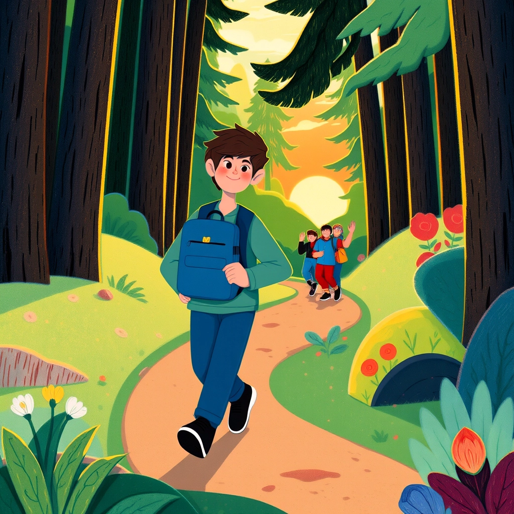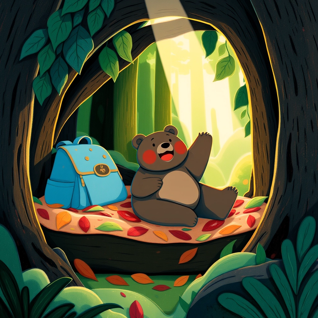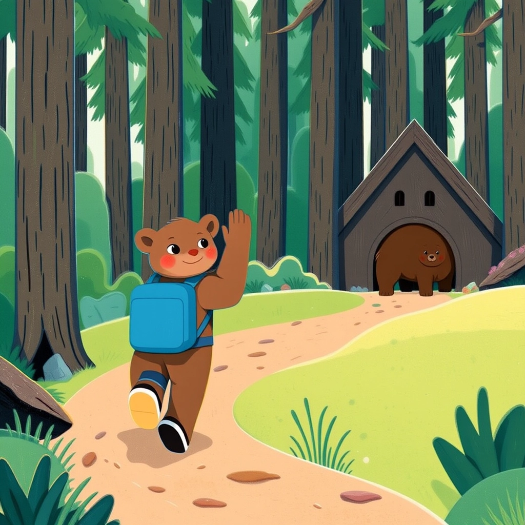 Benny grabbed his backpack and waved to Mama Bear. ‘I'm off to play!’ he said as he skipped down the trail.