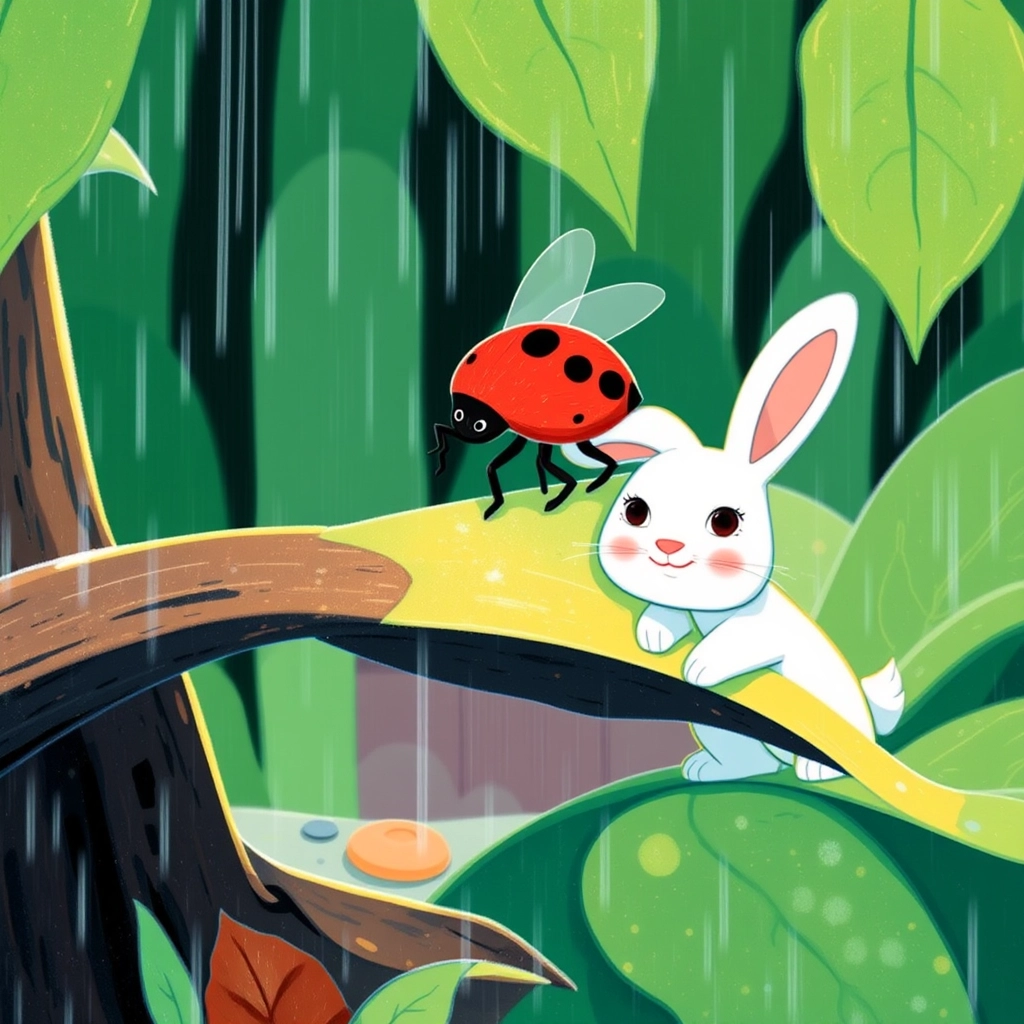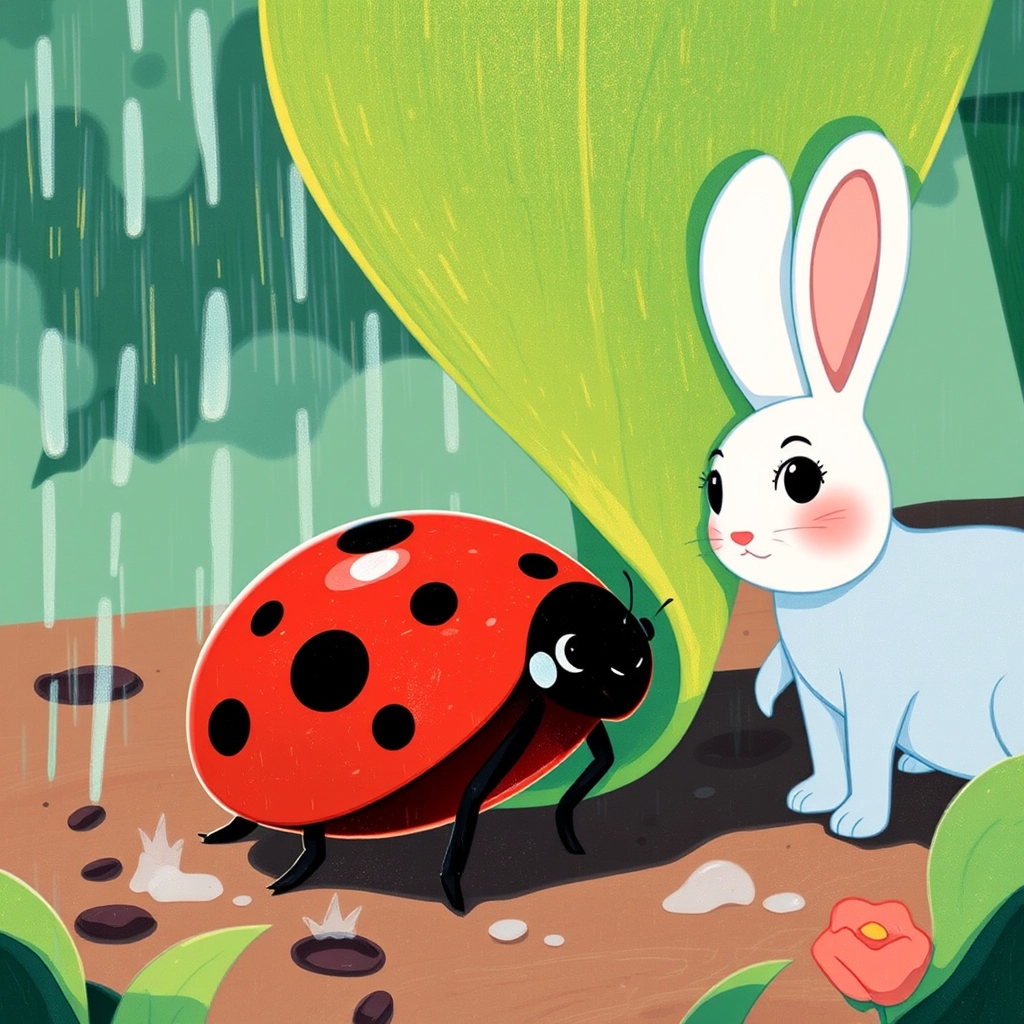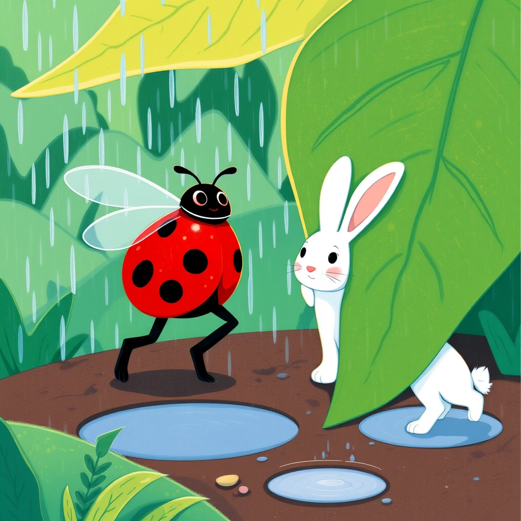 Just as [Benny](JHYK6KCR) was about to hide, he heard a tiny voice cry, 'Help!' It was [Lucy](2W4LG2K3) the Ladybug! She was stuck under a leaf that was too heavy for her to lift.