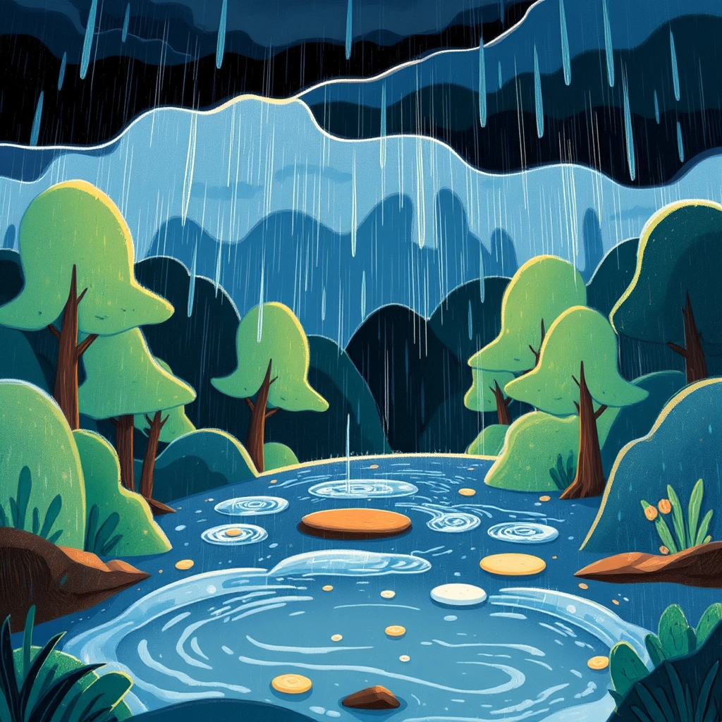 One day, the sky turned dark, and the wind whooshed through the trees. Drip, drop, plop! The rain began.