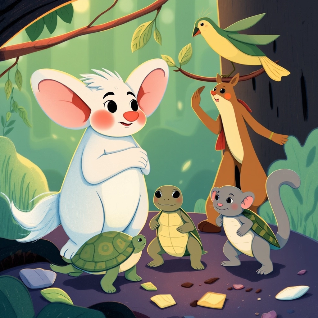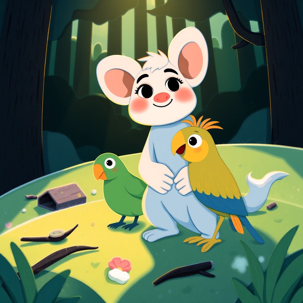 Suddenly, a loud CRACK! echoed from the woods. The animals froze. [Polly](NFG5Z9ZD) nervously said, 'What was that?!' [Benny](Q65TS9TW), determined, replied, 'Let’s go find out together!'