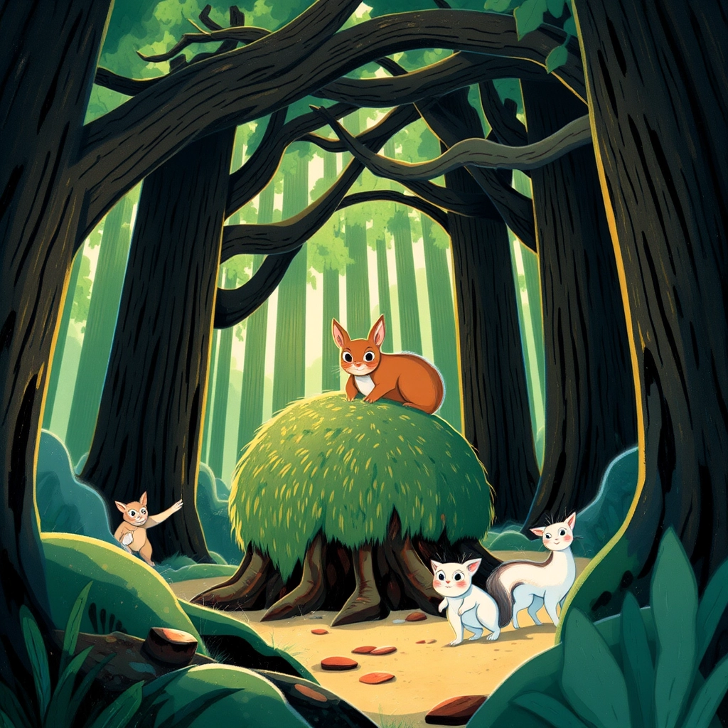 The friends tiptoed into the forest. They found a baby squirrel stuck in a bush, sniffling and saying, 'I can’t get out…'