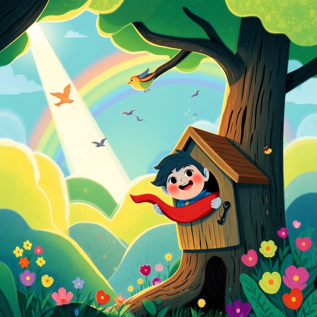 Then one sunny morning, Squeezy peeked his head out and saw a big rainbow stretching across the sky. ‘Today is the day!’ he cheered.